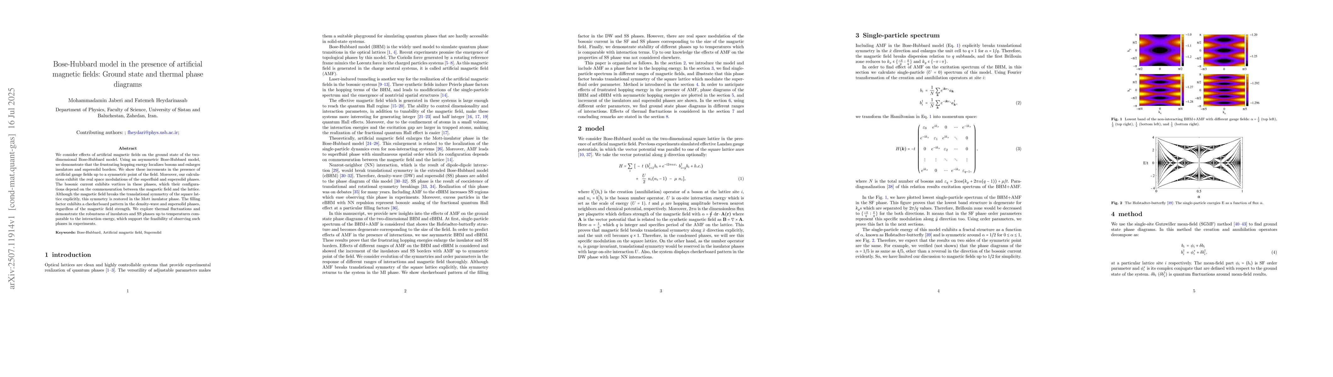 We consider effects of artificial magnetic fields on the ground state of the two-dimensional Bose-Hubbard model. Using an asymmetric Bose-Hubbard model, we demonstrate that the frustrating hopping energy localizes bosons and enlarges insulators and supersolid borders. We show these increments in the presence of artificial gauge fields up to a symmetric point of the field. Moreover, our calculations exhibit the real space modulations of the superfluid and supersolid phases. The bosonic current exhibits vortices in these phases, which their configurations depend on the commensuration between the magnetic field and the lattice. Although the magnetic field breaks the translational symmetry of the square lattice explicitly, this symmetry is restored in the Mott insulator phase. The filling factor exhibits a checkerboard pattern in the density-wave and supersolid phases, regardless of the magnetic field strength. We explore thermal fluctuations and demonstrate the robustness of insulators and SS phases up to temperatures comparable to the interaction energy, which support the feasibility of observing such phases in experiments.