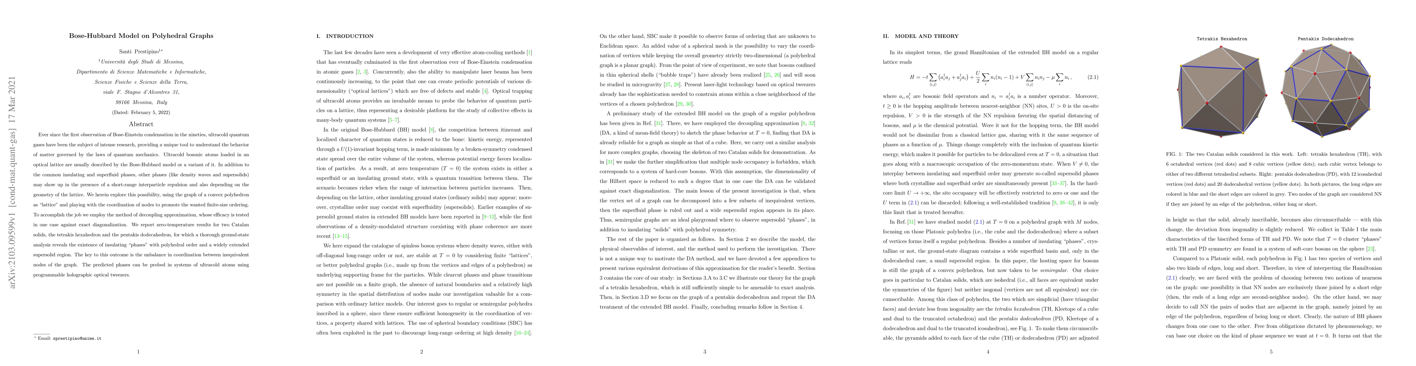 Researchers explore the Bose-Hubbard model on polyhedral graphs, discovering insulating phases with polyhedral order and a wide supersolid region in two specific Catalan solids.