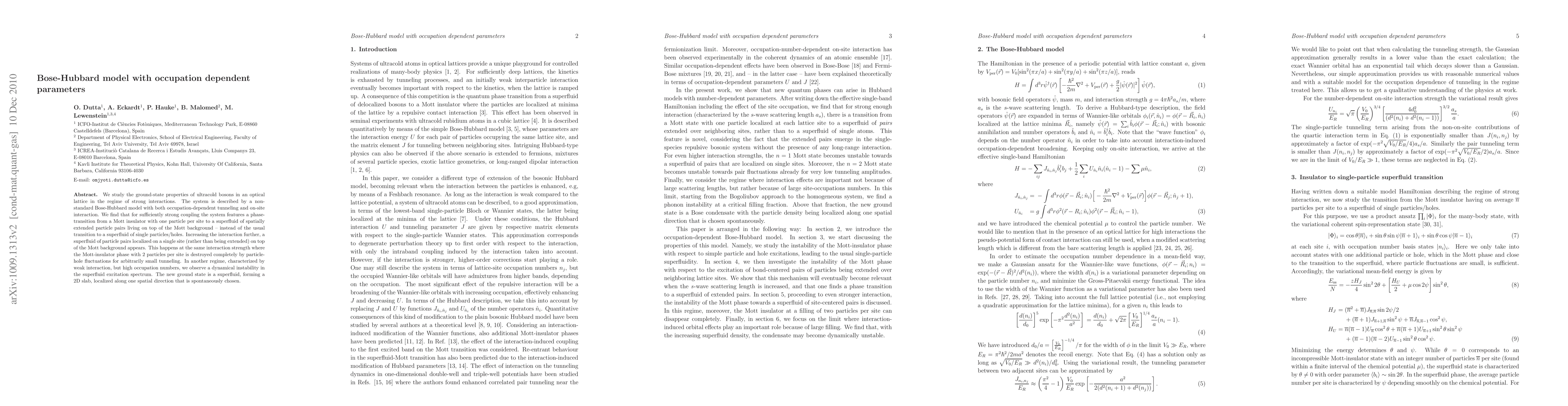 We study the ground-state properties of ultracold bosons in an optical lattice in the regime of strong interactions. The system is described by a non-standard Bose-Hubbard model with both occupation-dependent tunneling and on-site interaction. We find that for sufficiently strong coupling the system features a phase-transition from a Mott insulator with one particle per site to a superfluid of spatially extended particle pairs living on top of the Mott background -- instead of the usual transition to a superfluid of single particles/holes. Increasing the interaction further, a superfluid of particle pairs localized on a single site (rather than being extended) on top of the Mott background appears. This happens at the same interaction strength where the Mott-insulator phase with 2 particles per site is destroyed completely by particle-hole fluctuations for arbitrarily small tunneling. In another regime, characterized by weak interaction, but high occupation numbers, we observe a dynamical instability in the superfluid excitation spectrum. The new ground state is a superfluid, forming a 2D slab, localized along one spatial direction that is spontaneously chosen.