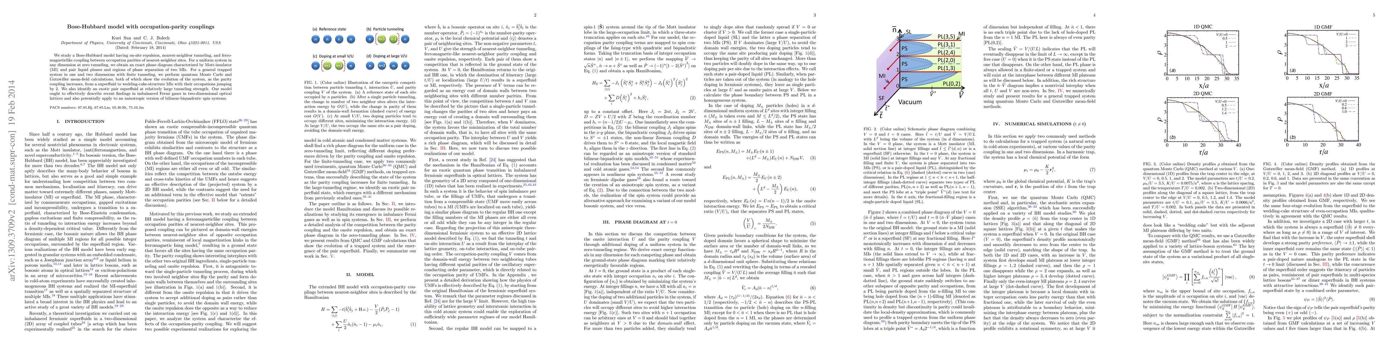 We study a Bose-Hubbard model having on-site repulsion, nearest-neighbor tunneling, and ferromagneticlike coupling between occupation parities of nearest-neighbor sites. For a uniform system in any dimension at zero tunneling, we obtain an exact phase diagram characterized by Mott-insulator (MI) and pair liquid phases and regions of phase separation of two MIs. For a general trapped system in one and two dimensions with finite tunneling, we perform quantum Monte Carlo and Gutzwiller mean-field calculations, both of which show the evolution of the system, as the parity coupling increases, from a superfluid to wedding-cake-structure MIs with their occupations jumping by 2. We also identify an exotic pair superfluid at relatively large tunneling strength. Our model ought to effectively describe recent findings in imbalanced Fermi gases in two-dimensional optical lattices and also potentially apply to an anisotropic version of bilinear-biquadratic spin systems.