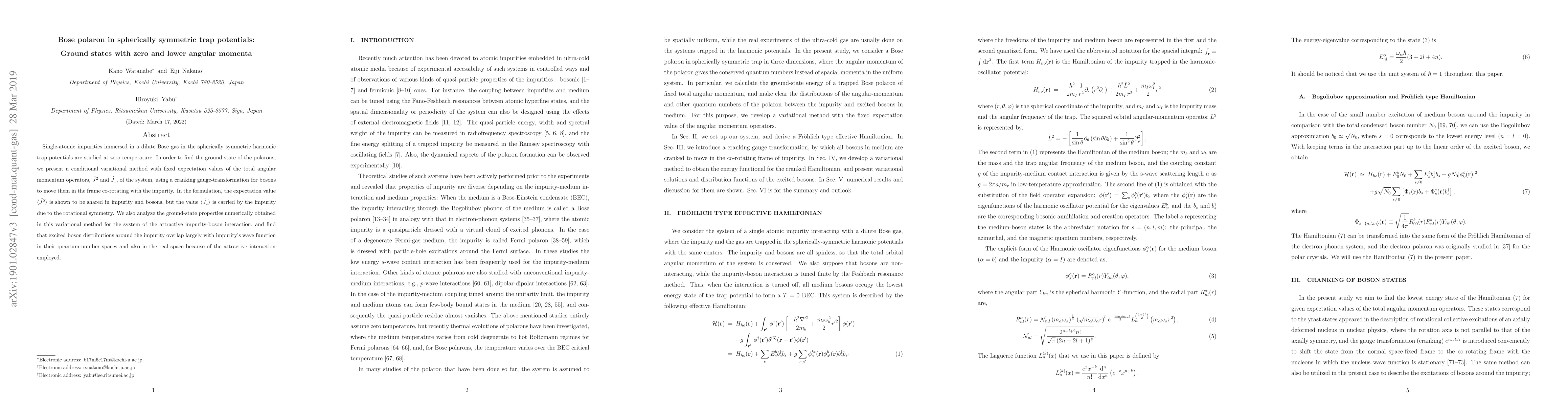 Single-atomic impurities immersed in a dilute Bose gas in the spherically symmetric harmonic trap potentials are studied at zero temperature. In order to find the ground state of the polarons, we present a conditional variational method with fixed expectation values of the total angular momentum operators, $\hat{J}^2$ and $\hat{J}_z$, of the system, using a cranking gauge-transformation for bosons to move them in the frame co-rotating with the impurity. In the formulation, the expectation value $\langle \hat{J^2}\rangle$ is shown to be shared in impurity and bosons, but the value $\langle \hat{J}_z\rangle$ is carried by the impurity due to the rotational symmetry. We also analyze the ground-state properties numerically obtained in this variational method for the system of the attractive impurity-boson interaction, and find that excited boson distributions around the impurity overlap largely with impurity's wave function in their quantum-number spaces and also in the real space because of the attractive interaction employed.