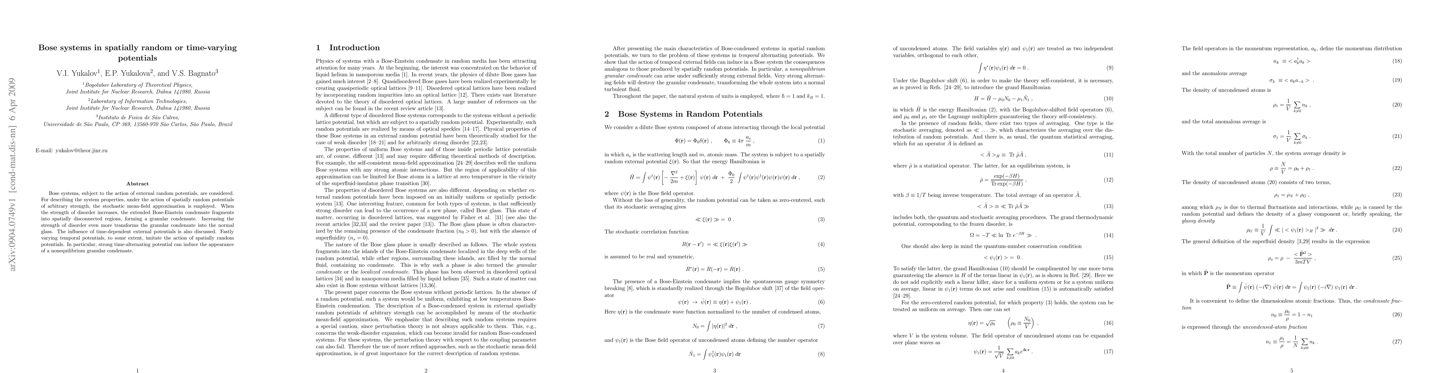 The paper presents a detailed analysis of Bose systems in spatially random or time-varying potentials using stochastic mean-field approximation, identifying phase transitions and demonstrating the failure of weak-disorder perturbation theory.