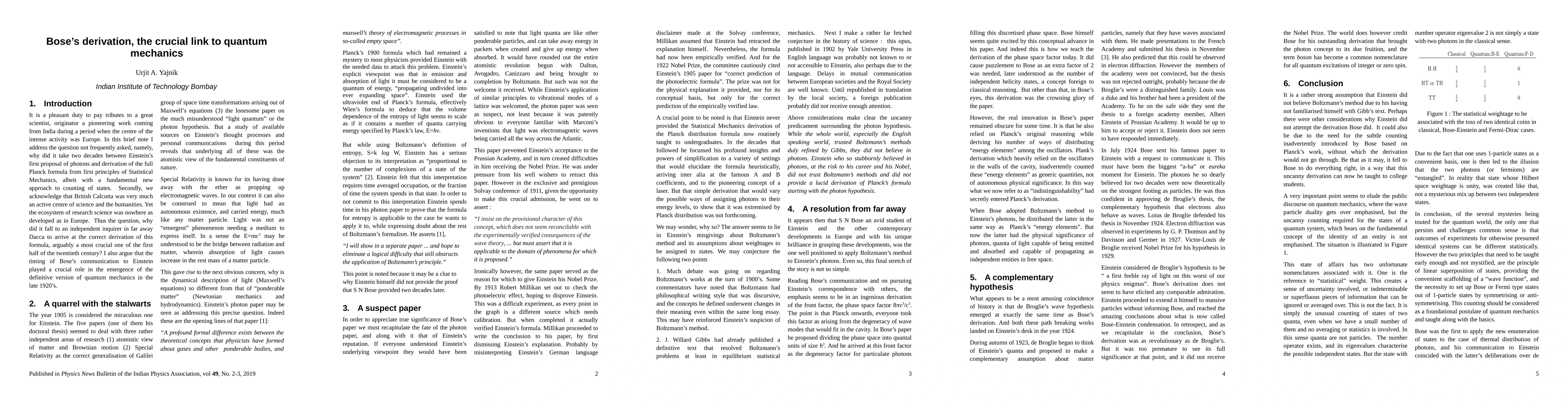 In this brief note I address the question not frequently asked, namely, why did it take two decades between Einstein's first proposal of photons and derivation of the full Planck formula from first principles of Statistical Mechanics, albeit with a fundamental new approach to counting of states. Secondly, why did it fall to an independent inquirer, S. N. Bose, in far away Dacca to arrive at the correct derivation of this formula, arguably a most crucial one of the first half of the twentieth century? Reasonable hypotheses are proposed for answers to both. I also argue that the timing of Bose's communication to Einstein played a crucial role in Einstein's approval of de Broglie's thesis and hence the emergence of the definitive version of quantum mechanics in the late 1920's.