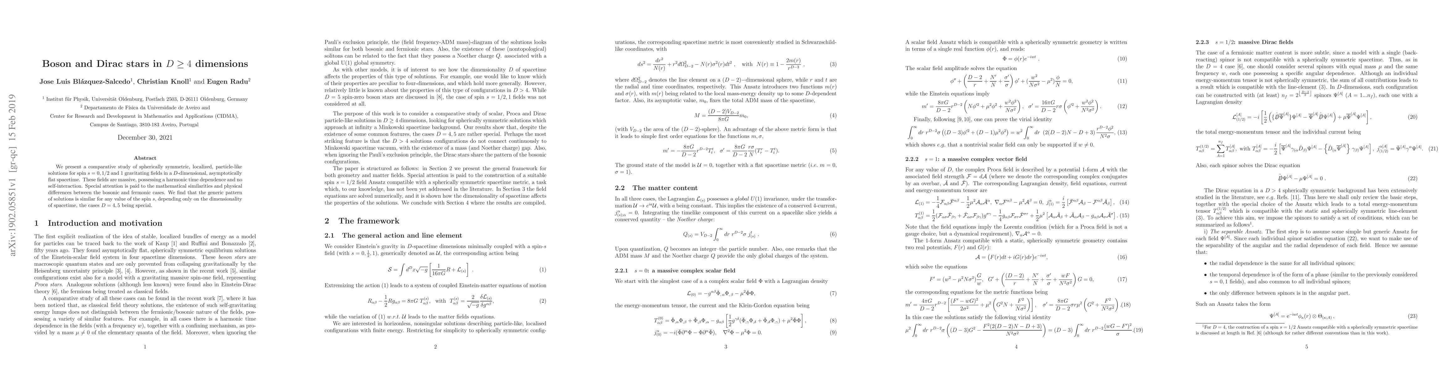 The paper presents a detailed comparative study of spherically symmetric, localized, particle-like solutions for gravitating fields with different spins in D-dimensional spacetime, highlighting mathematical similarities and physical differences between bosonic and fermonic cases.
