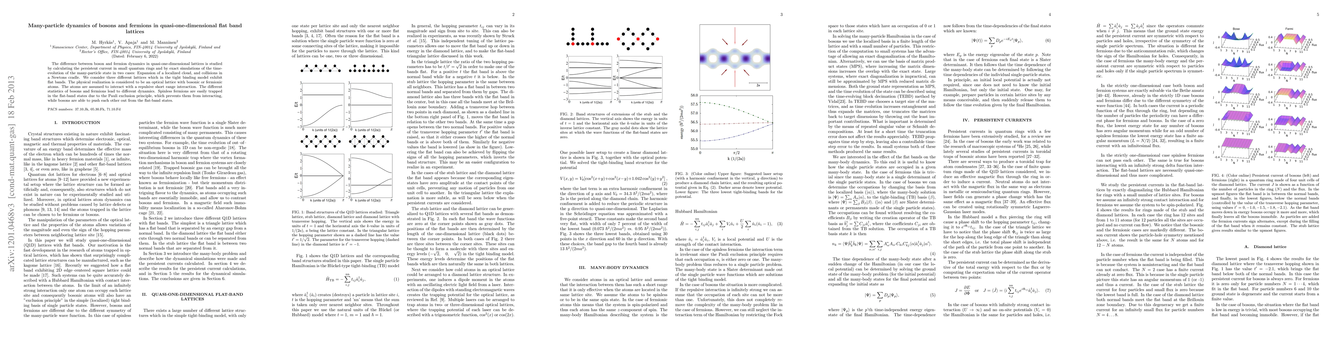 The difference between boson and fermion dynamics in quasi-one-dimensional lattices is studied with exact simulations of particle motion and by calculating the persistent current in small quantum rings. We consider three different lattices which in the tight binding model exhibit flat bands. The physical realization is considered to be an optical lattice with bosonic or fermionic atoms. The atoms are assumed to interact with a repulsive short range interaction. The different statistics of bosons and fermions causes different dynamics. Spinless fermions are easily trapped in the flat band states due to the Pauli exclusion principle, which prevents them from interacting, while boson are able to push each other out from the flat band states.