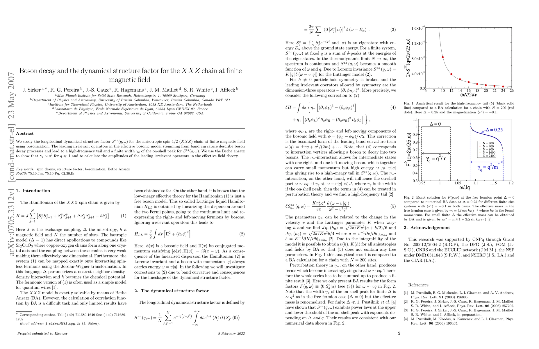 This paper investigates the longitudinal dynamical structure factor $S^{zz}(q,\omega)$ for the XXZ spin-1/2 chain under a finite magnetic field using bosonization. It reveals that leading irrelevant operators in the bosonic model lead to a high-frequency tail and a finite width $\gamma_q$ in the on-shell peak, with $\gamma_q\sim q^2$ for small $q$, calculated via the Bethe ansatz.