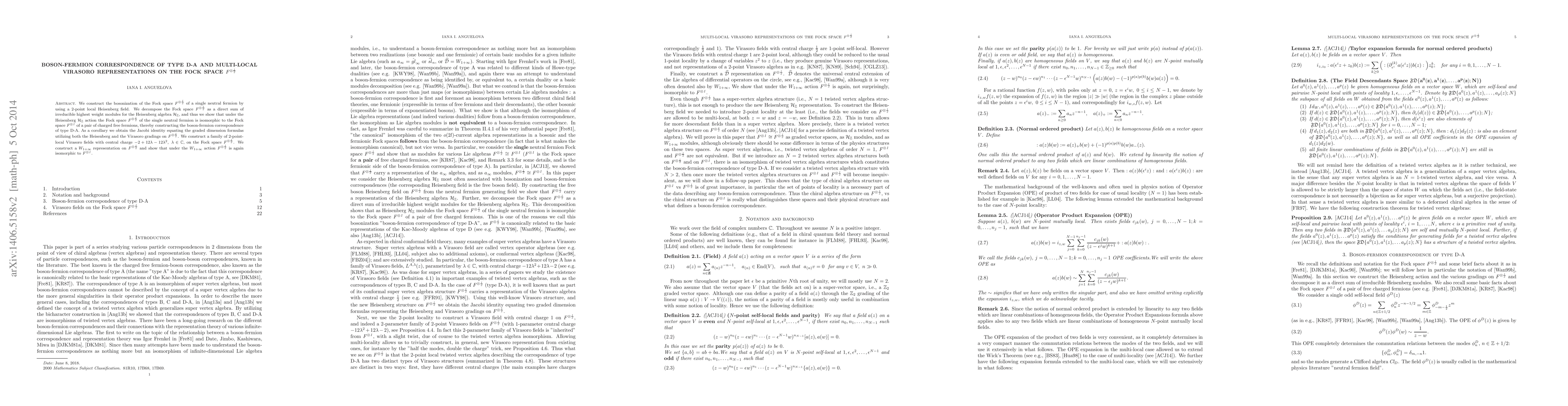 This paper constructs the bosonization of a fermion Fock space using a 2-point local Heisenberg field, demonstrating a type D-A boson-fermion correspondence and deriving a Jacobi identity for the associated graded dimensions. It also constructs multi-local Virasoro representations and shows an isomorphism between the Fock space of a single fermion and a pair of charged fermions under a $W_{1+\infty}$ action.