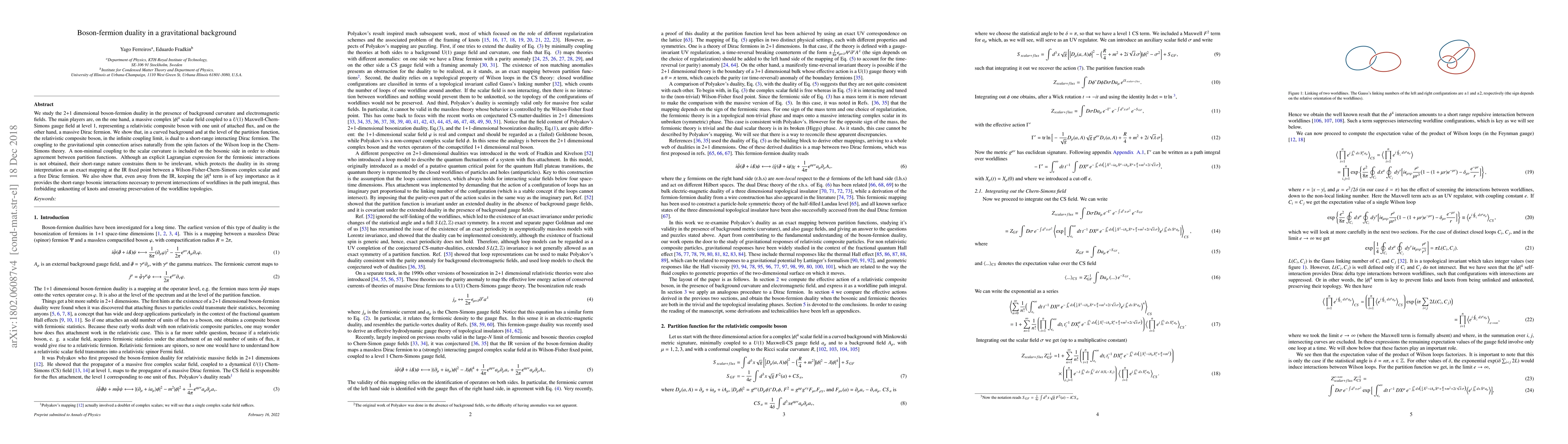 We study the $2+1$ dimensional boson-fermion duality in the presence of background curvature and electromagnetic fields. The main players are, on the one hand, a massive complex $|\phi|^4$ scalar field coupled to a $U(1)$ Maxwell-Chern-Simons gauge field at level $1$, representing a relativistic composite boson with one unit of attached flux, and on the other hand, a massive Dirac fermion. We show that, in a curved background and at the level of the partition function, the relativistic composite boson, in the infinite coupling limit, is dual to a short-range interacting Dirac fermion. The coupling to the gravitational spin connection arises naturally from the spin factors of the Wilson loop in the Chern-Simons theory. A non-minimal coupling to the scalar curvature is included on the bosonic side in order to obtain agreement between partition functions. Although an explicit Lagrangian expression for the fermionic interactions is not obtained, their short-range nature constrains them to be irrelevant, which protects the duality in its strong interpretation as an exact mapping at the IR fixed point between a Wilson-Fischer-Chern-Simons complex scalar and a free Dirac fermion. We also show that, even away from the IR, keeping the $|\phi|^4$ term is of key importance as it provides the short-range bosonic interactions necessary to prevent intersections of worldlines in the path integral, thus forbidding unknotting of knots and ensuring preservation of the worldline topologies.
