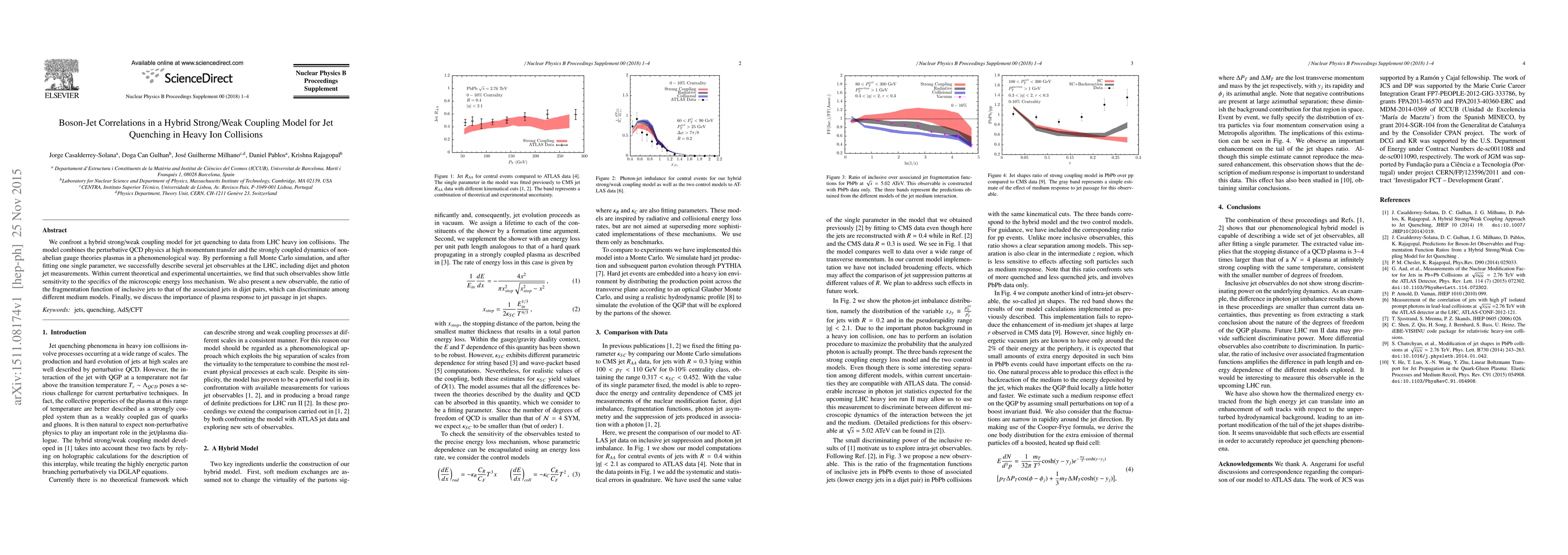 We confront a hybrid strong/weak coupling model for jet quenching to data from LHC heavy ion collisions. The model combines the perturbative QCD physics at high momentum transfer and the strongly coupled dynamics of non- abelian gauge theories plasmas in a phenomenological way. By performing a full Monte Carlo simulation, and after fitting one single parameter, we successfully describe several jet observables at the LHC, including dijet and photon jet measurements. Within current theoretical and experimental uncertainties, we find that such observables show little sensitivity to the specifics of the microscopic energy loss mechanism. We also present a new observable, the ratio of the fragmentation function of inclusive jets to that of the associated jets in dijet pairs, which can discriminate among different medium models. Finally, we discuss the importance of plasma response to jet passage in jet shapes.