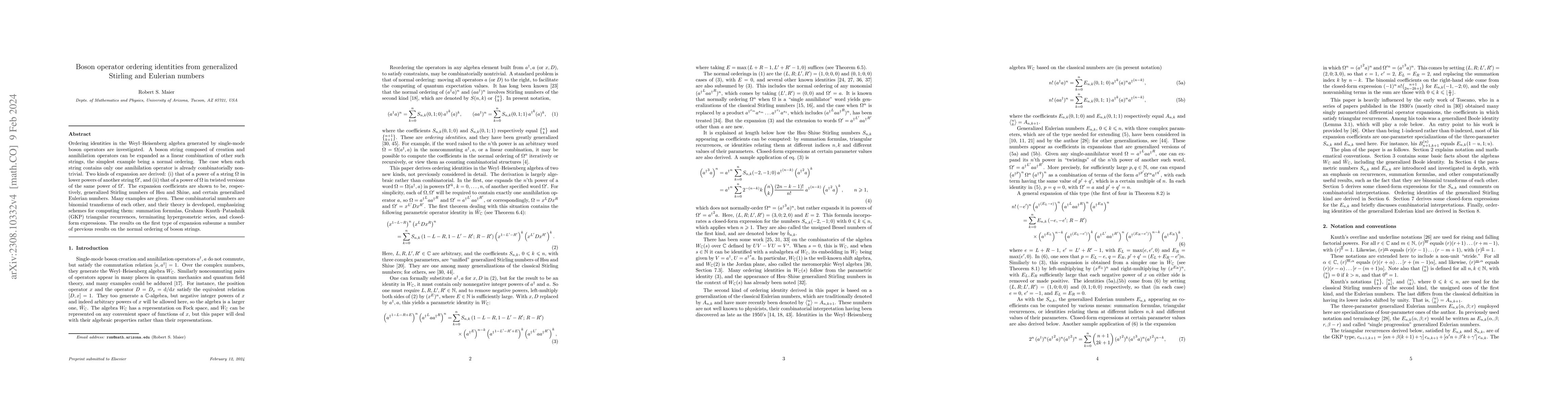 This paper investigates boson operator ordering identities in the Weyl-Heisenberg algebra, deriving expansions using generalized Stirling and Eulerian numbers. It develops methods for computing these combinatorial numbers and shows their applications in normal ordering of boson strings.