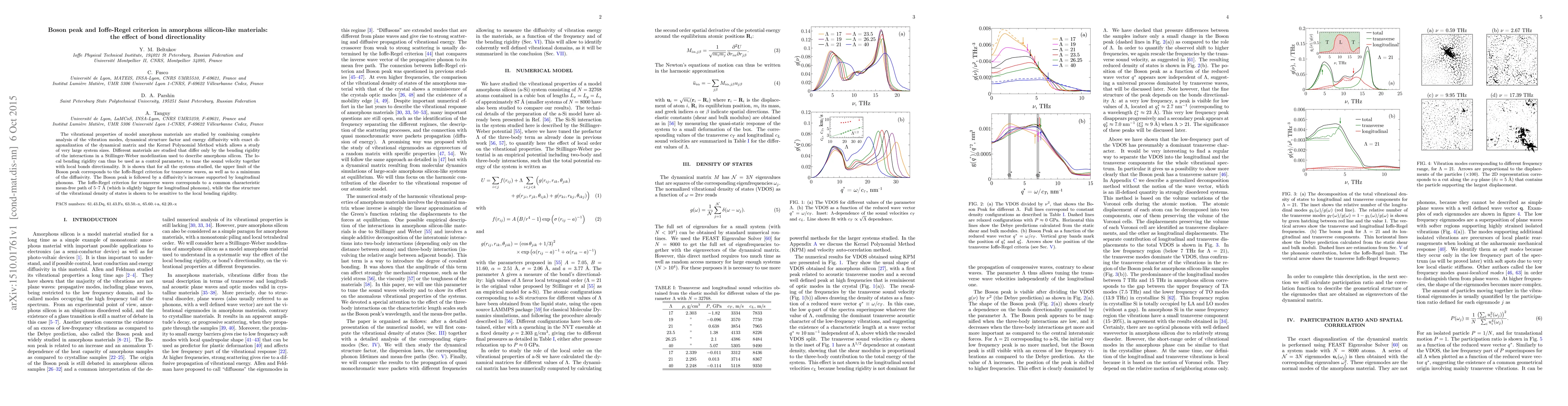 This study investigates the vibrational properties of amorphous silicon-like materials using advanced computational methods, revealing that the Boson peak's upper limit aligns with the Ioffe-Regel criterion for transverse waves and correlates with a minimum in energy diffusivity. The local bending rigidity and bond directionality significantly influence the fine structure of the vibrational density of states.