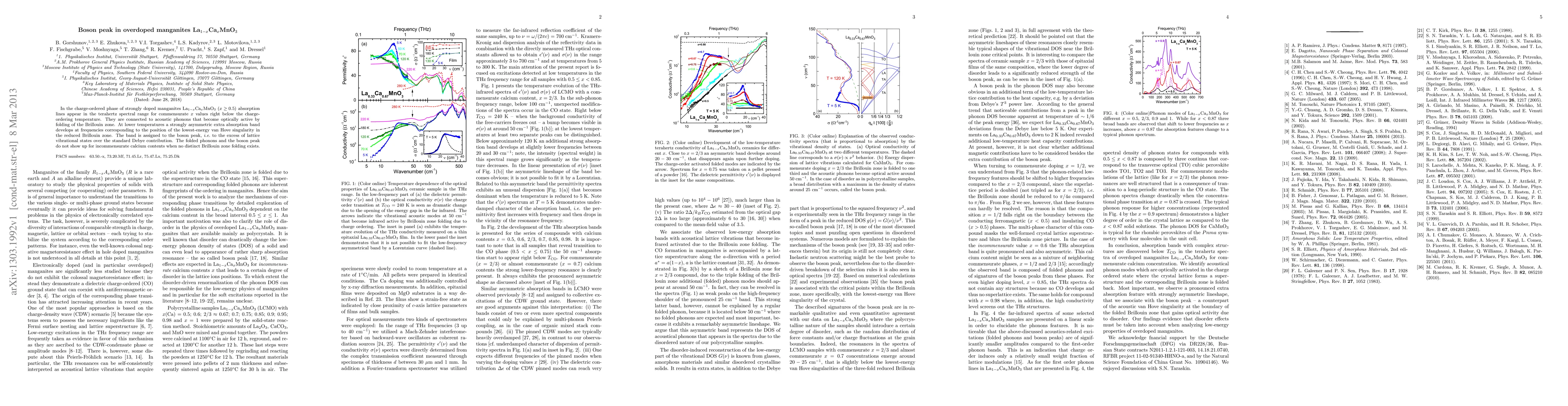 In the charge-ordered phase of strongly doped manganites La$_{1-x}$Ca$_x$MnO$_3$ ($x \geq 0.5$) absorption lines appear in the terahertz spectral range for commensurate $x$ values right below the charge-ordering temperature. They are connected to acoustic phonons that become optically active by folding of the Brillouin zone. At lower temperatures a strongly asymmetric extra absorption band develops at frequencies corresponding to the position of the lowest-energy van Hove singularity in the reduced Brillouin zone. The band is assigned to the boson peak, i.e. to the excess of lattice vibrational states over the standard Debye contribution. The folded phonons and the boson peak do not show up for incommensurate calcium contents when no distinct Brillouin zone folding exists.