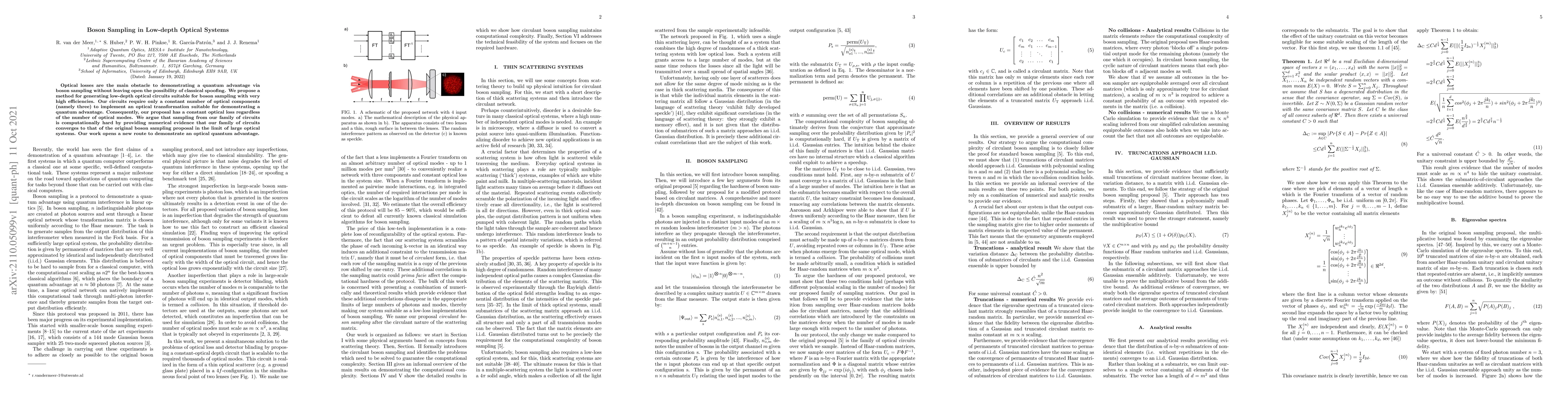 This paper proposes low-depth optical circuits for boson sampling that maintain high efficiency and constant optical loss, using only three optical components. The authors argue computational hardness and suggest this approach offers a new method to demonstrate an optical quantum advantage.
