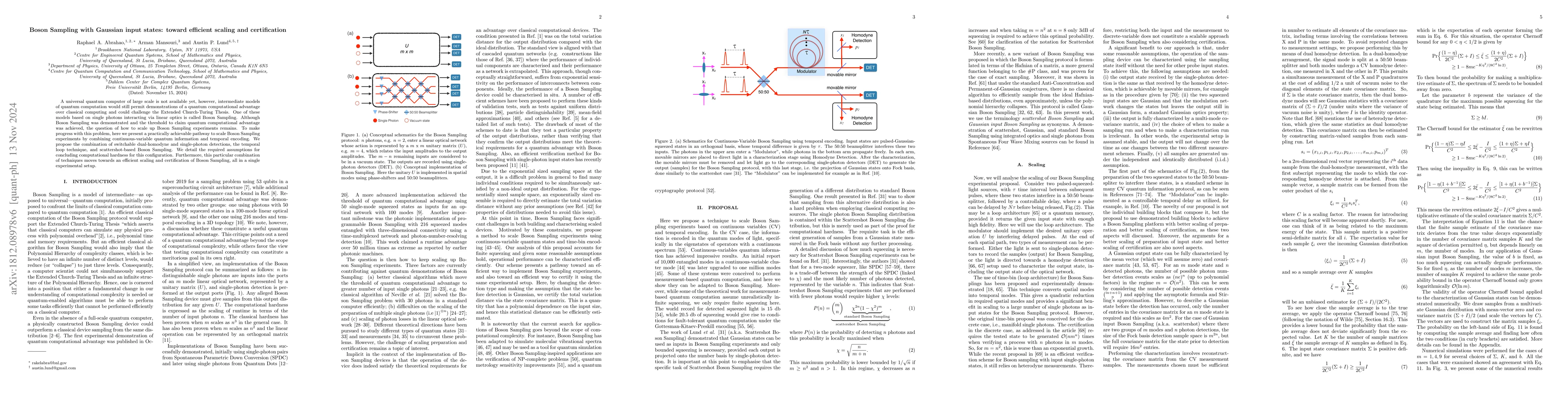 The paper introduces a novel combination of techniques (switchable dual-homodyne and single-photon detections, temporal loop, and scattershot-based Boson Sampling) for efficient scaling and certification of Boson Sampling experiments.