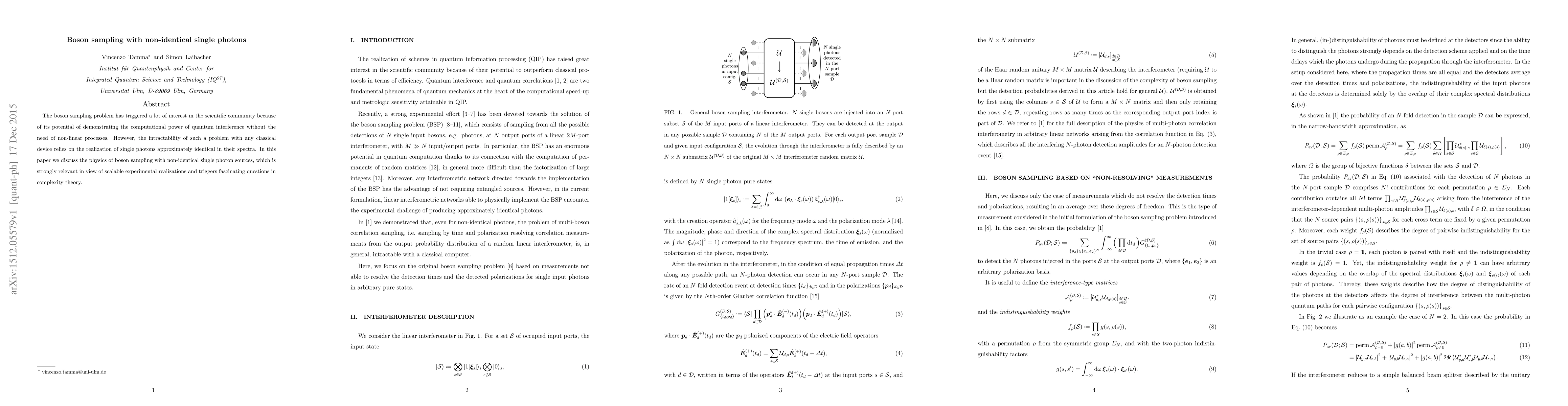 The paper discusses boson sampling with non-identical single photon sources, focusing on the physics relevant for scalable experimental realizations and complexity theory questions.