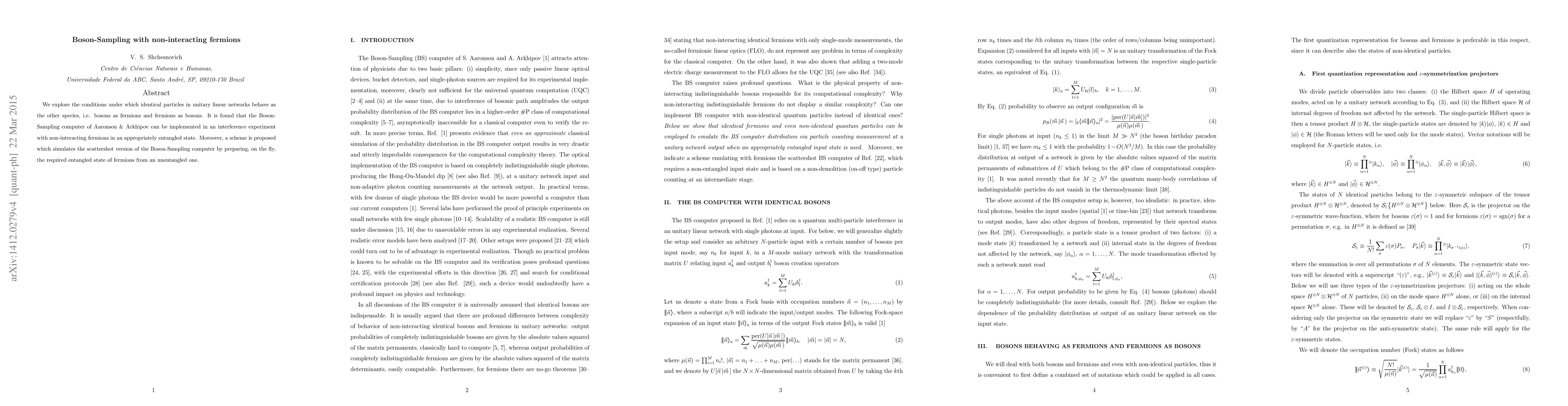We explore the conditions under which identical particles in unitary linear networks behave as the other species, i.e. bosons as fermions and fermions as bosons. It is found that the Boson-Sampling computer of Aaronson & Arkhipov can be implemented in an interference experiment with non-interacting fermions in an appropriately entangled state. Moreover, a scheme is proposed which simulates the scattershot version of the Boson-Sampling computer by preparing, on the fly, the required entangled state of fermions from an unentangled one.