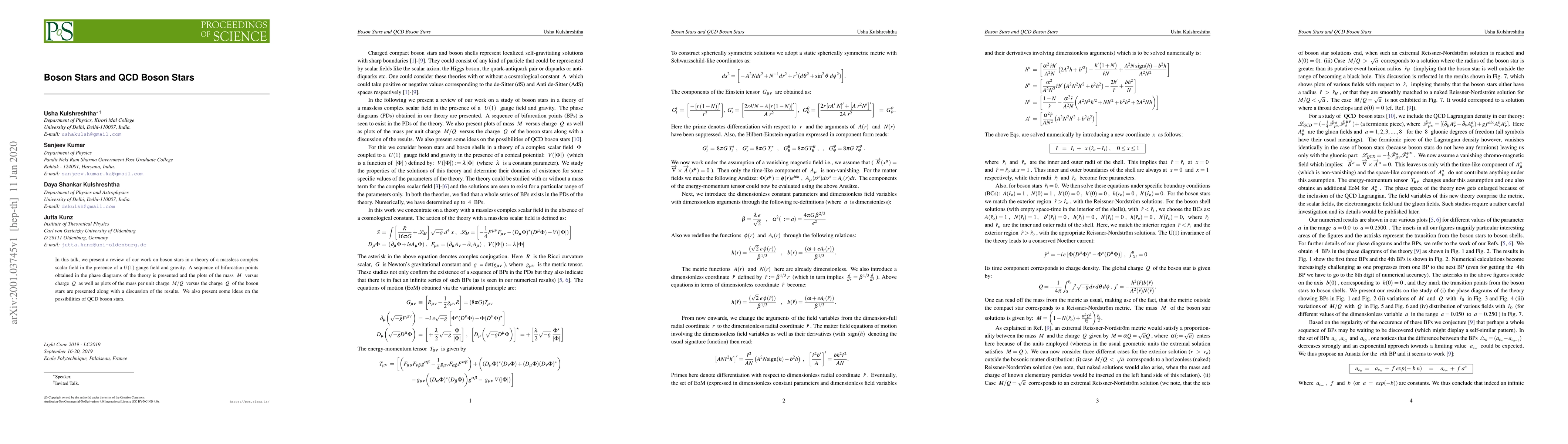 This paper reviews the study of boson stars in a theory combining a massless complex scalar field, a $U(1)$ gauge field, and gravity, presenting phase diagrams and mass-charge relationships. It also explores the potential for QCD boson stars.