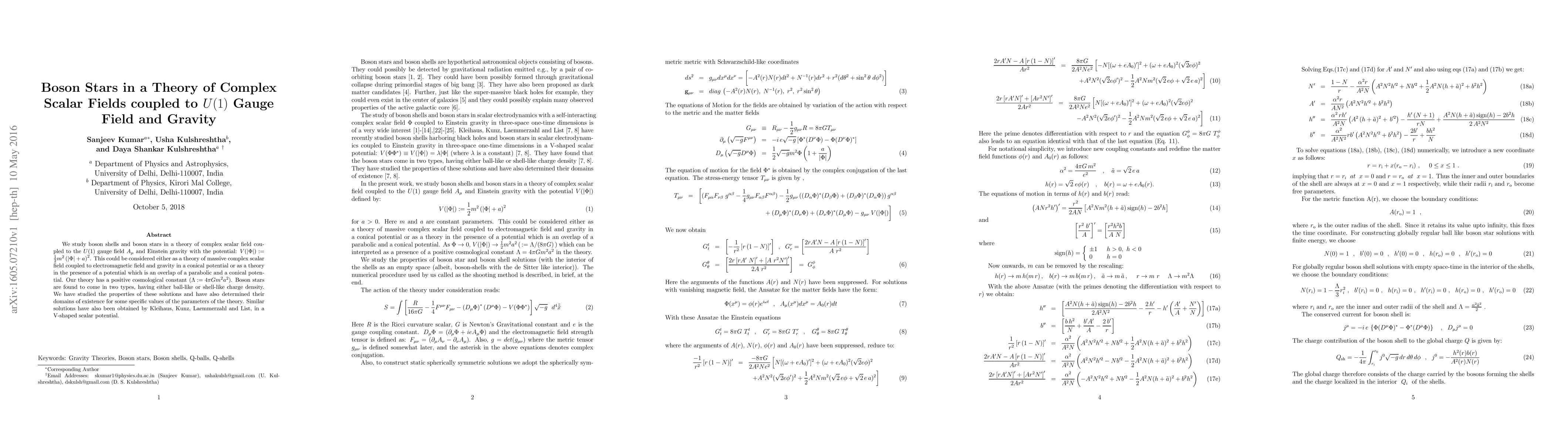 We study boson shells and boson stars in a theory of complex scalar field coupled to the $U(1)$ gauge field $A_{\mu}$ and Einstein gravity with the potential: $V(|\Phi|) := \frac{1}{2} m^{2} \left(|\Phi|+ a \right)^2$. This could be considered either as a theory of massive complex scalar field coupled to electromagnetic field and gravity in a conical potential or as a theory in the presence of a potential which is an overlap of a parabolic and a conical potential. Our theory has a positive cosmological constant $(\Lambda := 4 \pi G m^2 a^2)$. Boson stars are found to come in two types, having either ball-like or shell-like charge density. We have studied the properties of these solutions and have also determined their domains of existence for some specific values of the parameters of the theory. Similar solutions have also been obtained by Kleihaus, Kunz, Laemmerzahl and List, in a V-shaped scalar potential.