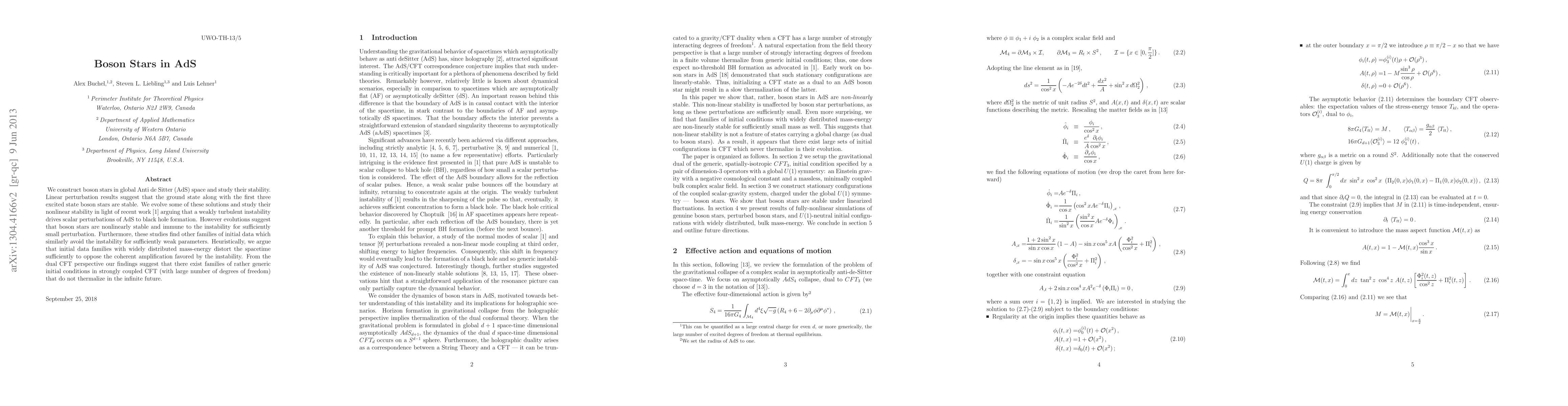 This paper constructs and investigates boson stars in global Anti de Sitter (AdS) space, finding that the ground state and first three excited states are stable. It concludes that these boson stars are nonlinearly stable and resistant to the instability that leads to black hole formation in AdS, suggesting that widely distributed mass-energy configurations can prevent thermalization in strongly coupled CFTs.