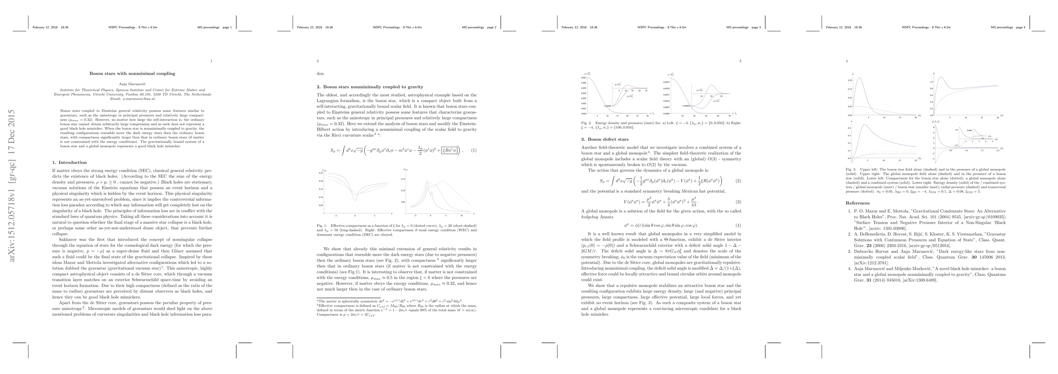 Boson stars coupled to Einstein's general relativity possess some features similar to gravastars, such as the anisotropy in principal pressures and relatively large compactness ($\mu_{max} = 0.32$). However, no matter how large the self-interaction is, the ordinary boson star cannot obtain arbitrarily large compression and as such does not represent a good black hole mimicker. When the boson star is nonminimally coupled to gravity, the resulting configurations resemble more the dark energy stars then the ordinary boson stars, with compactness significantly larger then that in ordinary boson stars (if matter is not constrained with the energy conditions). The gravitationally bound system of a boson star and a global monopole represents a good black hole mimicker.