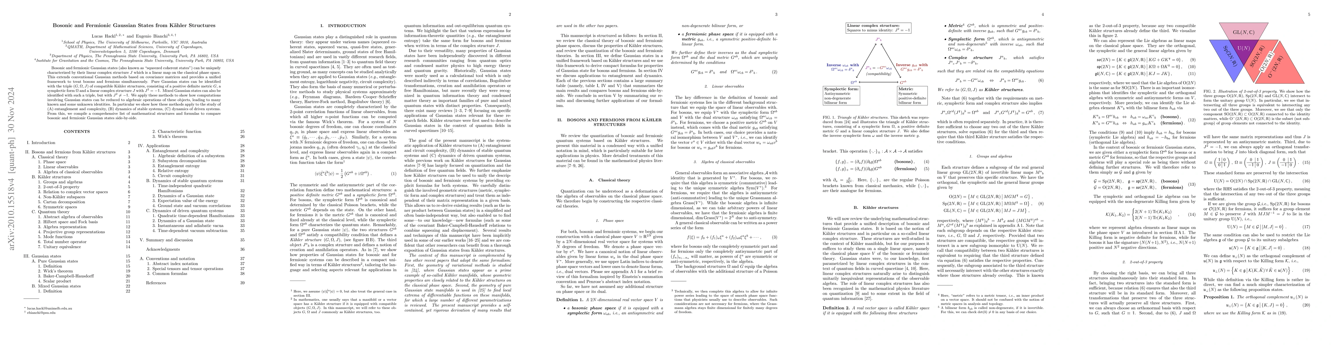 We show that bosonic and fermionic Gaussian states (also known as "squeezed coherent states") can be uniquely characterized by their linear complex structure $J$ which is a linear map on the classical phase space. This extends conventional Gaussian methods based on covariance matrices and provides a unified framework to treat bosons and fermions simultaneously. Pure Gaussian states can be identified with the triple $(G,\Omega,J)$ of compatible K\"ahler structures, consisting of a positive definite metric $G$, a symplectic form $\Omega$ and a linear complex structure $J$ with $J^2=-1\!\!1$. Mixed Gaussian states can also be identified with such a triple, but with $J^2\neq -1\!\!1$. We apply these methods to show how computations involving Gaussian states can be reduced to algebraic operations of these objects, leading to many known and some unknown identities. We apply these methods to the study of (A) entanglement and complexity, (B) dynamics of stable systems, (C) dynamics of driven systems. From this, we compile a comprehensive list of mathematical structures and formulas to compare bosonic and fermionic Gaussian states side-by-side.