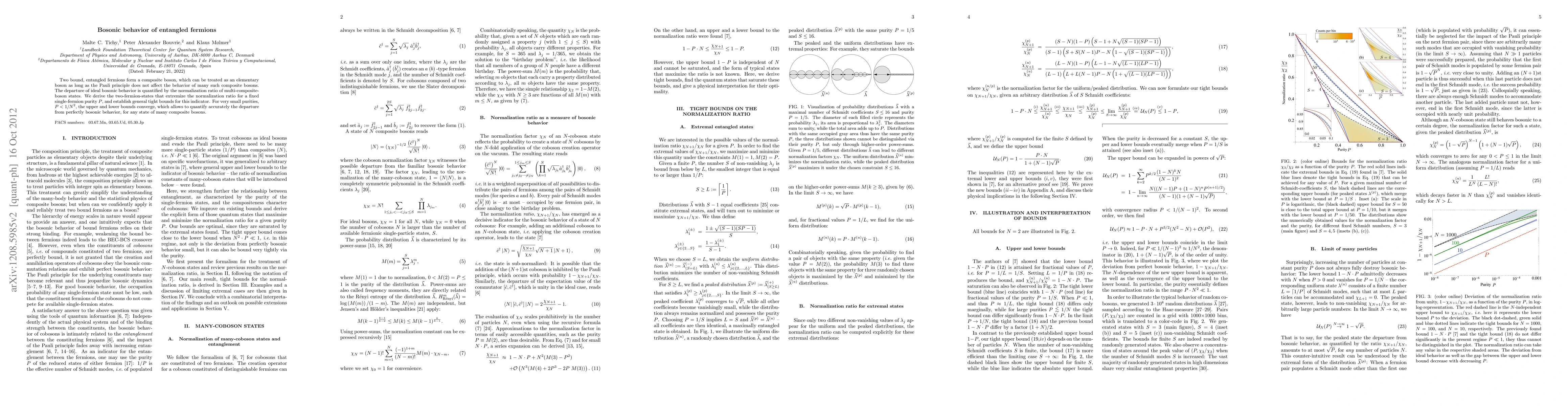 This paper investigates how entangled fermions can behave as composite bosons, quantifying the deviation from ideal bosonic behavior through a normalization ratio. It establishes tight bounds for this ratio, showing that for low purities, the bounds converge, allowing precise measurement of the departure from perfect bosonic behavior.