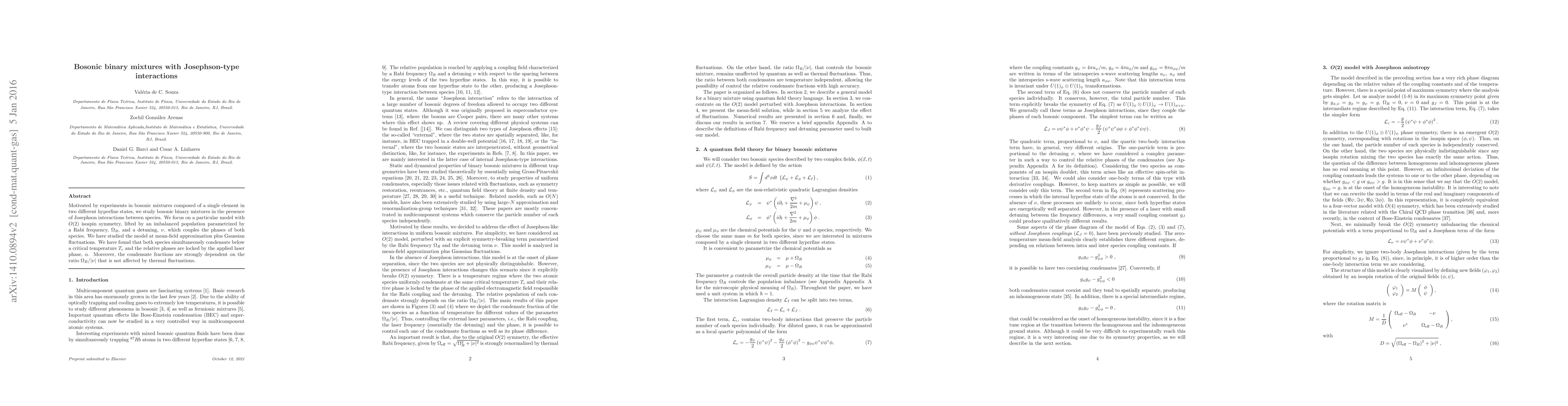 Motivated by experiments in bosonic mixtures composed of a single element in two different hyperfine states, we study bosonic binary mixtures in the presence of Josephson interactions between species. We focus on a particular model with $O(2)$ isospin symmetry, lifted by an imbalanced population parametrized by a Rabi frequency, $\Omega _{R}$, and a detuning, $\nu $, which couples the phases of both species. We have studied the model at mean-field approximation plus Gaussian fluctuations. We have found that both species simultaneously condensate below a critical temperature $T_{c}$ and the relative phases are locked by the applied laser phase, $\alpha$. Moreover, the condensate fractions are strongly dependent on the ratio $\Omega _{R}/|\nu |$ that is not affected by thermal fluctuations.