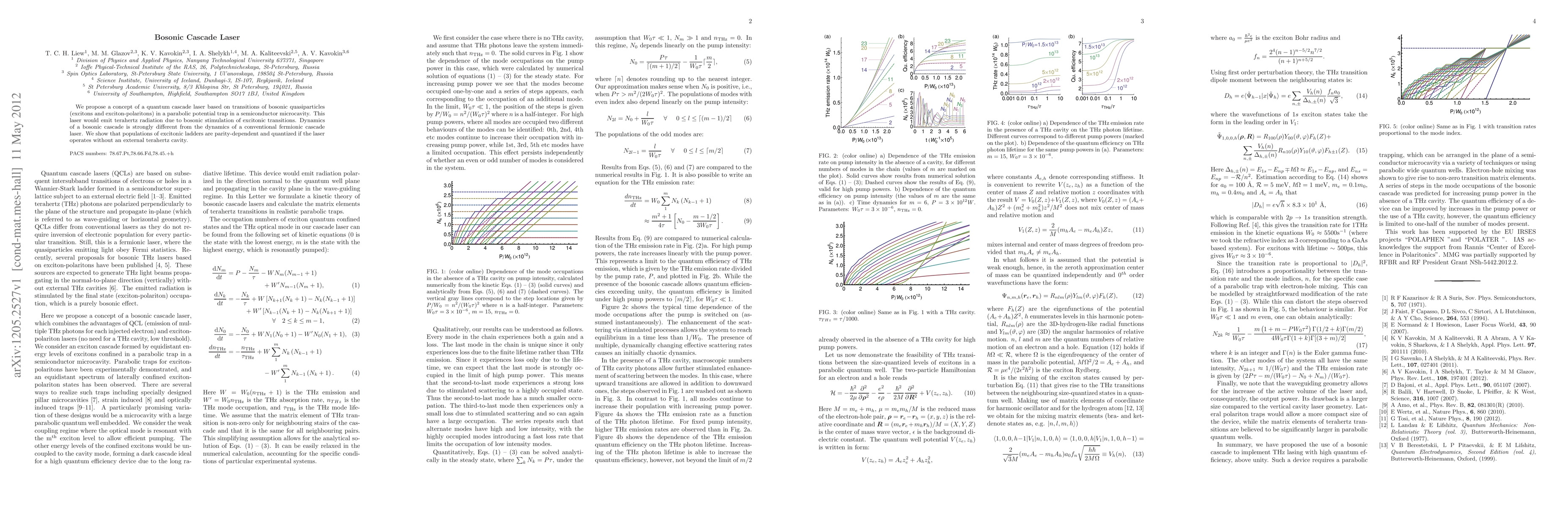 The paper proposes a quantum cascade laser utilizing bosonic quasiparticles (excitons and exciton-polaritons) in a semiconductor microcavity, emitting terahertz radiation via bosonic stimulation. The dynamics of this bosonic cascade differ significantly from conventional fermionic lasers, with quantized, parity-dependent excitonic ladder populations in the absence of an external terahertz cavity.