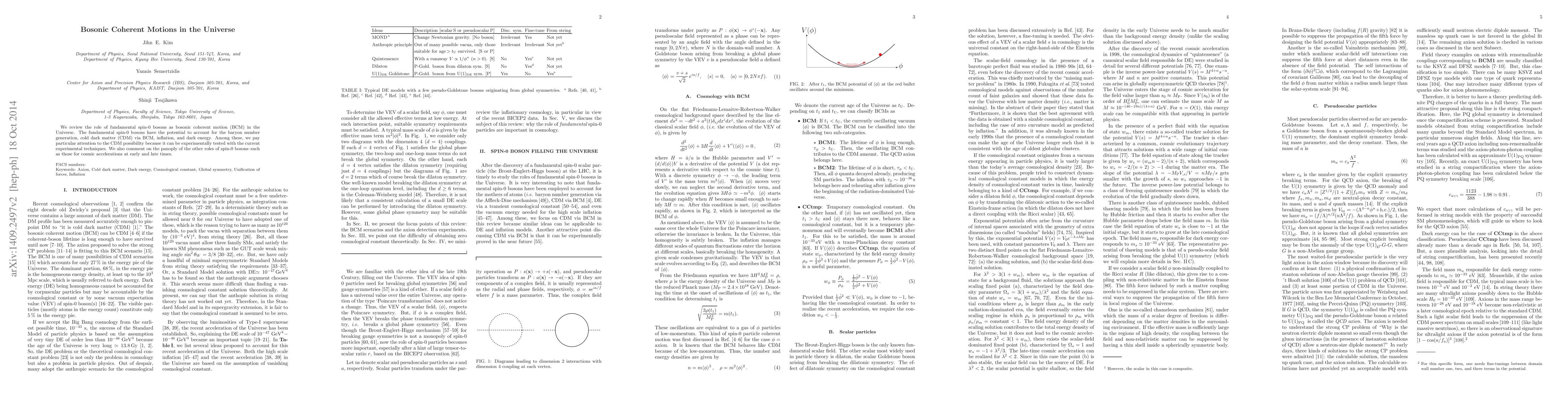 The paper discusses the role of fundamental spin-0 bosons as bosonic coherent motion (BCM) in the Universe, focusing on their potential to explain cold dark matter (CDM). It highlights that CDM via BCM can be experimentally tested with current techniques, while briefly mentioning other possible roles of spin-0 bosons in accounting for baryon number generation, dark energy, and inflation.