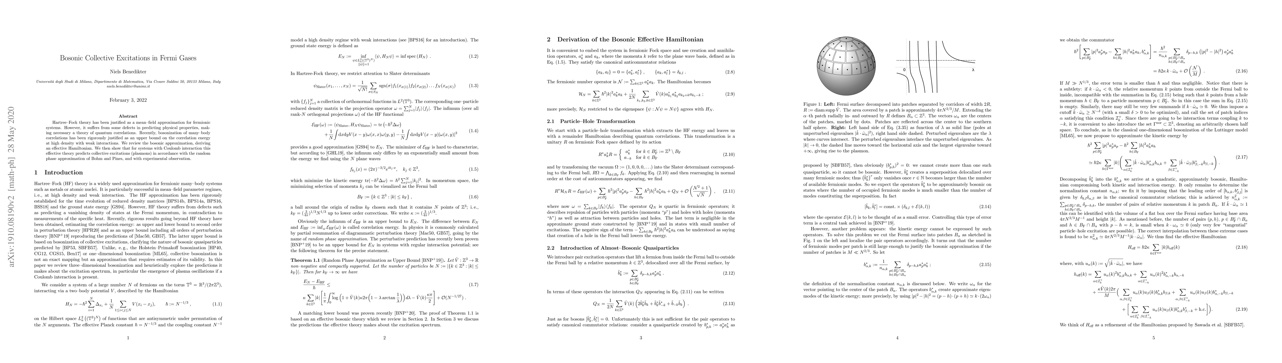 This paper reviews the bosonic approximation for fermionic systems, deriving an effective Hamiltonian that predicts collective excitations (plasmons) in accordance with the random phase approximation and experimental observations, addressing the limitations of Hartree-Fock theory in predicting physical properties.