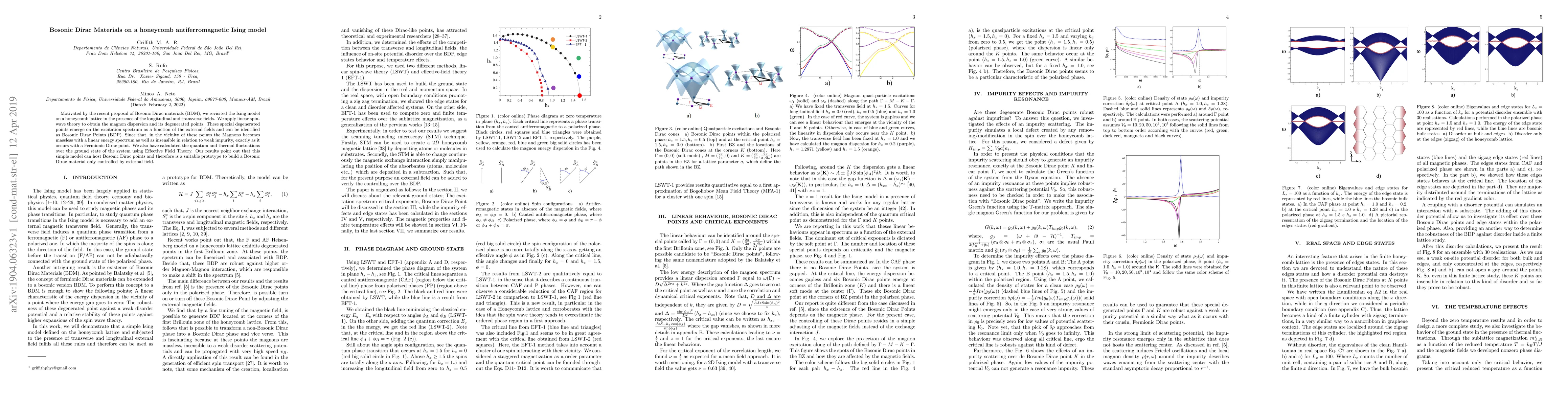 This paper investigates the Ising model on a honeycomb lattice under longitudinal and transverse fields, revealing the existence of Bosonic Dirac Points (BDP) through linear spin-wave theory. These points exhibit massless magnons with a linear energy spectrum, similar to Fermionic Dirac points, and are robust against weak impurities.