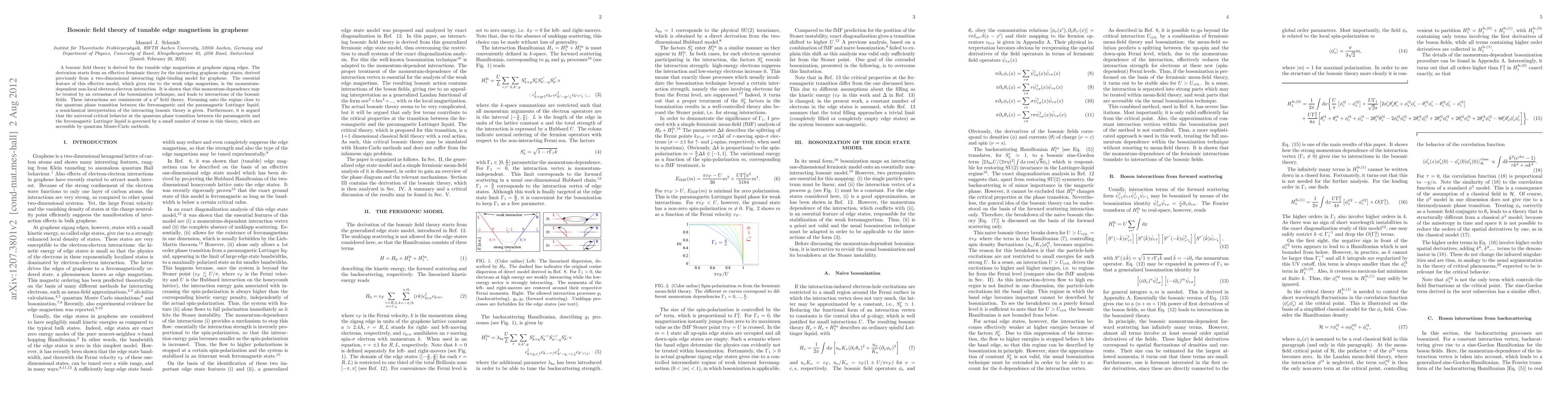 A bosonic field theory is derived for the tunable edge magnetism at graphene zigzag edges. The derivation starts from an effective fermionic theory for the interacting graphene edge states, derived previously from a two-dimensional interacting tight-binding model for graphene. The essential feature of this effective model, which gives rise to the weak edge magnetism, is the momentum-dependent non-local electron-electron interaction. It is shown that this momentum-dependence may be treated by an extension of the bosonization technique, and leads to interactions of the bosonic fields. These interactions are reminiscent of a \phi^4 field theory. Focussing onto the regime close to the quantum phase transition between the ferromagnetic and the paramagnetic Luttinger liquid, a semiclassical interpretation of the interacting bosonic theory is given. Furthermore, it is argued that the universal critical behavior at the quantum phase transition between the paramagnetic and the ferromagnetic Luttinger liquid is governed by a small number of terms in this theory, which are accessible by quantum Monte-Carlo methods.