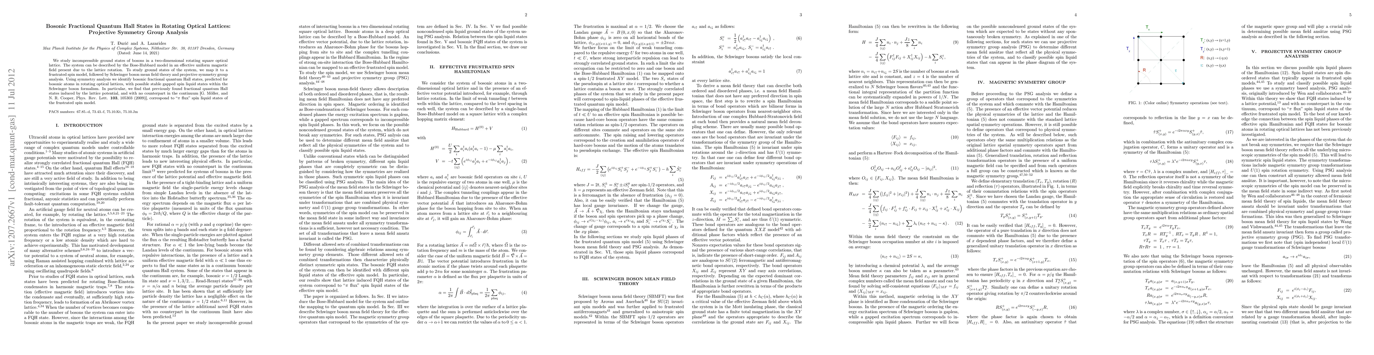 This research investigates bosonic fractional quantum Hall states in rotating optical lattices through projective symmetry group analysis. It employs a Bose-Hubbard model, maps it to a frustrated spin model, and uses Schwinger boson mean field theory to identify stable gapped spin liquid states, including previously noted "$\pi$ flux" spin liquids.