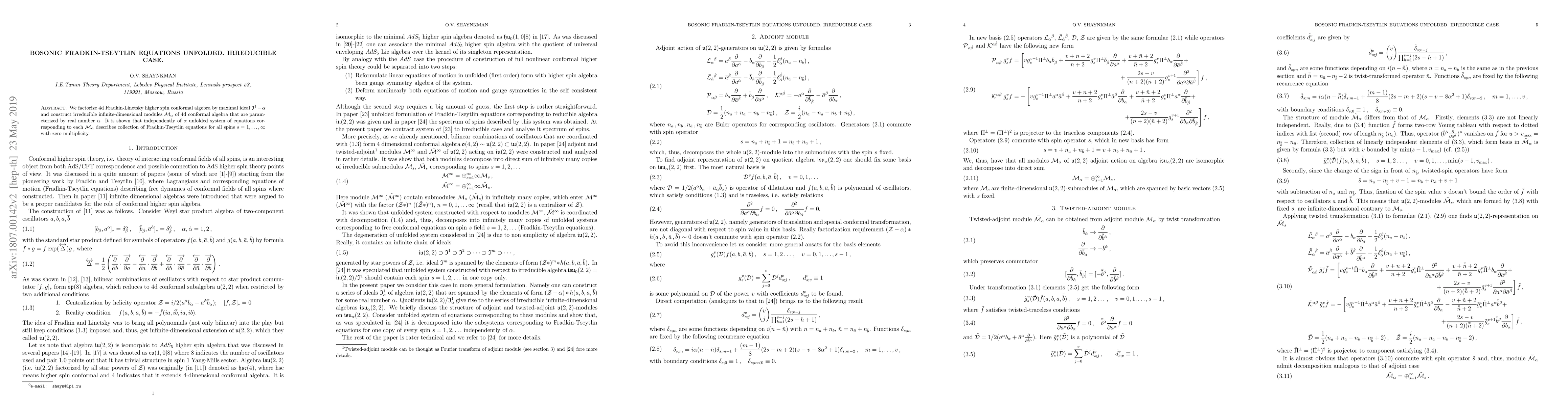 This research factorizes the 4d Fradkin-Linetsky higher spin conformal algebra, constructing irreducible infinite-dimensional modules M_α parameterized by real number α. It's shown that these modules' unfolded systems of equations describe Fradkin-Tseytlin equations for all spins, regardless of α.