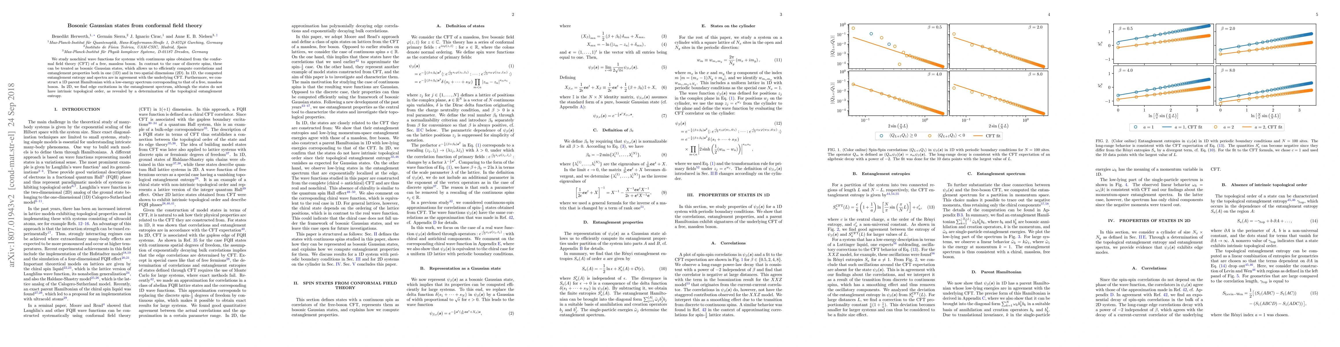 We study nonchiral wave functions for systems with continuous spins obtained from the conformal field theory (CFT) of a free, massless boson. In contrast to the case of discrete spins, these can be treated as bosonic Gaussian states, which allows us to efficiently compute correlations and entanglement properties both in one (1D) and in two spatial dimensions (2D). In 1D, the computed entanglement entropy and spectra are in agreement with the underlying CFT. Furthermore, we construct a 1D parent Hamiltonian with a low-energy spectrum corresponding to that of a free, massless boson. In 2D, we find edge excitations in the entanglement spectrum, although the states do not have intrinsic topological order, as revealed by a determination of the topological entanglement entropy.