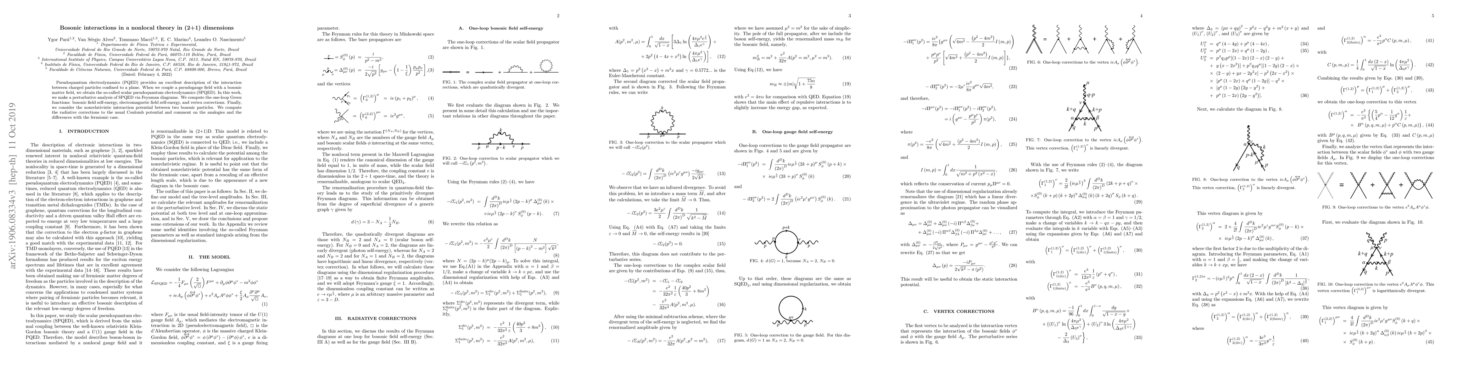 Pseudo-Quantum Electrodynamics (PQED) provides an excellent description of the interaction between charged particles confined to a plane. When we couple pseudo-gauge field with a bosonic matter field, we obtain the so-called Scalar Pseudo-Quantum Electrodynamics (SPQED). In this work, we make a perturbative analysis of SPQED via Feynman diagrams. We compute the one loop Green functions: bosonic field self-energy, electromagnetic field self-energy, and vertex corrections. Finally, we consider the non-relativistic interaction potential between two bosonic particles. We compute the radiative corrections to the usual Coulomb potential and comment on the analogies and the differences with the fermionic case.