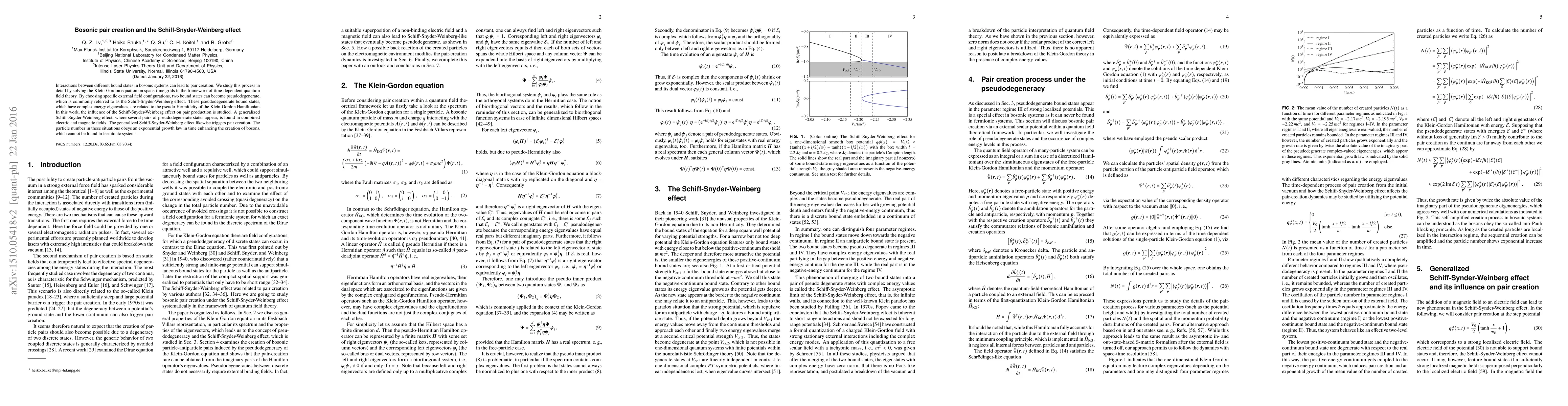 Interactions between different bound states in bosonic systems can lead to pair creation. We study this process in detail by solving the Klein-Gordon equation on space-time grids in the framework of time-dependent quantum field theory. By choosing specific external field configurations, two bound states can become pseudodegenerate, which is commonly referred to as the Schiff-Snyder-Weinberg effect. These pseudodegenerate bound states, which have complex energy eigenvalues, are related to the pseudo-Hermiticity of the Klein-Gordon Hamiltonian. In this work, the influence of the Schiff-Snyder-Weinberg effect on pair production is studied. A generalized Schiff-Snyder-Weinberg effect, where several pairs of pseudodegenerate states appear, is found in combined electric and magnetic fields. The generalized Schiff-Snyder-Weinberg effect likewise triggers pair creation. The particle number in these situations obeys an exponential growth law in time enhancing the creation of bosons, which cannot be found in fermionic systems.