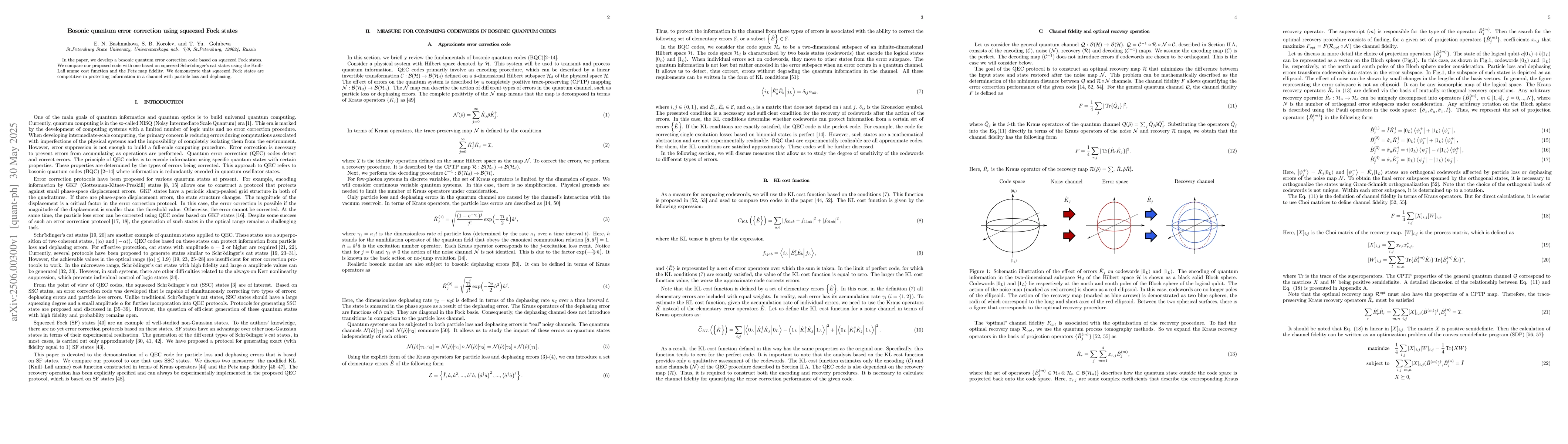 The paper introduces a new bosonic quantum error correction code using squeezed Fock states, which is shown to be competitive with a code based on squeezed cat states in protecting information from particle loss and dephasing. This is demonstrated through comparisons using the Knill-Laflamme cost function and Petz map fidelity.