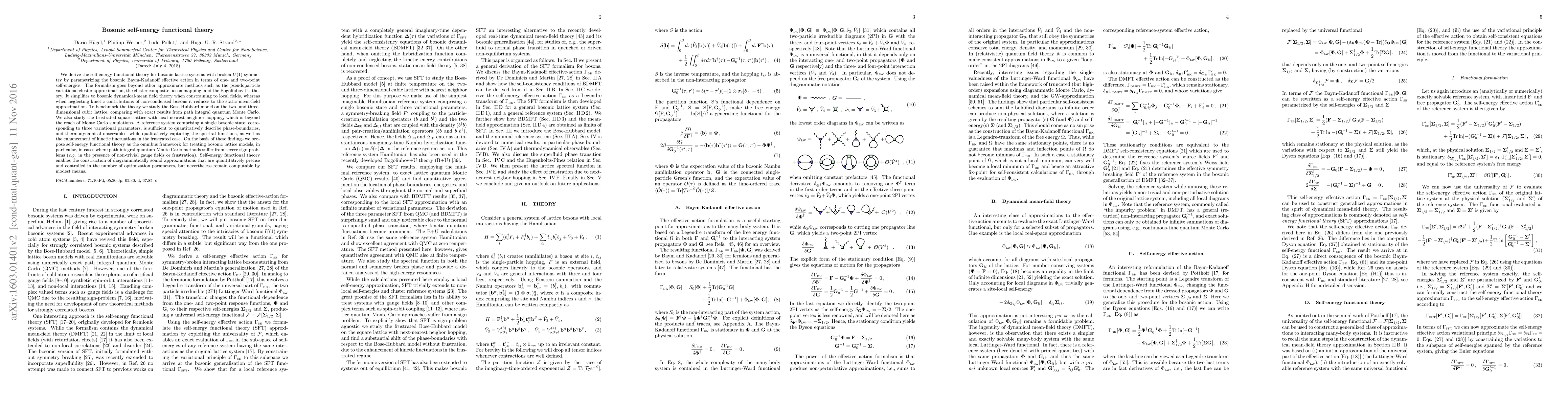We derive the self-energy functional theory for bosonic lattice systems with broken $U(1)$ symmetry by parametrizing the bosonic Baym-Kadanoff effective action in terms of one- and two-point self-energies. The formalism goes beyond other approximate methods such as the pseudoparticle variational cluster approximation, the cluster composite boson mapping, and the Bogoliubov+U theory. It simplifies to bosonic dynamical-mean field theory when constraining to local fields, whereas when neglecting kinetic contributions of non-condensed bosons it reduces to the static mean-field approximation. To benchmark the theory we study the Bose-Hubbard model on the two- and three-dimensional cubic lattice, comparing with exact results from path integral quantum Monte Carlo. We also study the frustrated square lattice with next-nearest neighbor hopping, which is beyond the reach of Monte Carlo simulations. A reference system comprising a single bosonic state, corresponding to three variational parameters, is sufficient to quantitatively describe phase-boundaries, and thermodynamical observables, while qualitatively capturing the spectral functions, as well as the enhancement of kinetic fluctuations in the frustrated case. On the basis of these findings we propose self-energy functional theory as the omnibus framework for treating bosonic lattice models, in particular, in cases where path integral quantum Monte Carlo methods suffer from severe sign problems (e.g. in the presence of non-trivial gauge fields or frustration). Self-energy functional theory enables the construction of diagrammatically sound approximations that are quantitatively precise and controlled in the number of optimization parameters, but nevertheless remain computable by modest means.
