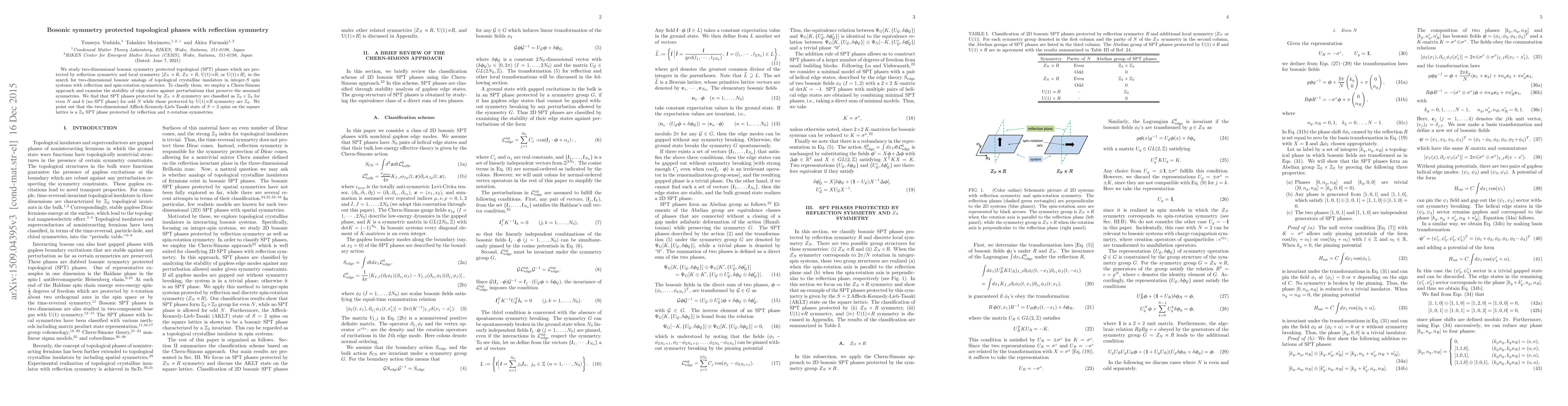 We study two-dimensional bosonic symmetry protected topological (SPT) phases which are protected by reflection symmetry and local symmetry [$Z_N\rtimes R$, $Z_N\times R$, U(1)$\rtimes R$, or U(1)$\times R$], in the search for two-dimensional bosonic analogs of topological crystalline insulators in integer-$S$ spin systems with reflection and spin-rotation symmetries. To classify them, we employ a Chern-Simons approach and examine the stability of edge states against perturbations that preserve the assumed symmetries. We find that SPT phases protected by $Z_N\rtimes R$ symmetry are classified as $\mathbb{Z}_2\times\mathbb{Z}_2$ for even $N$ and 0 (no SPT phase) for odd $N$ while those protected by U(1)$\rtimes R$ symmetry are $\mathbb{Z}_2$. We point out that the two-dimensional Affleck-Kennedy-Lieb-Tasaki state of $S=2$ spins on the square lattice is a $\mathbb{Z}_2$ SPT phase protected by reflection and $\pi$-rotation symmetries.