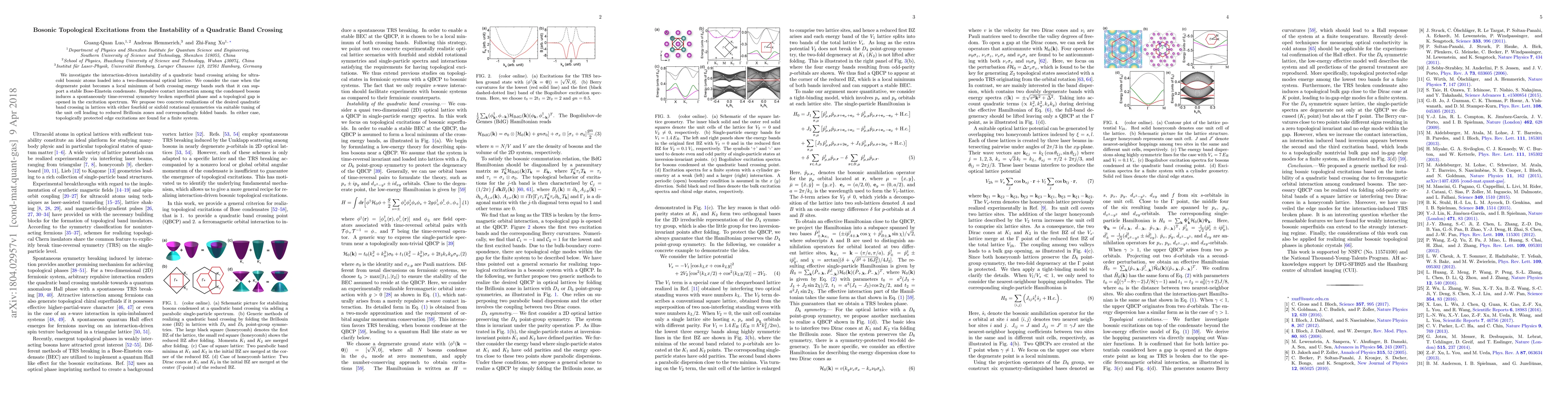 We investigate the interaction-driven instability of a quadratic band crossing arising for ultracold bosonic atoms loaded into a two-dimensional optical lattice. We consider the case when the degenerate point becomes a local minimum of both crossing energy bands such that it can support a stable Bose-Einstein condensate. Repulsive contact interaction among the condensed bosons induces a spontaneously time-reversal symmetry broken superfluid phase and a topological gap is opened in the excitation spectrum. We propose two concrete realizations of the desired quadratic band crossing in lattices with either fourfold or sixfold rotational symmetries via suitable tuning of the unit cell leading to reduced Brillouin zones and correspondingly folded bands. In either case, topologically protected edge excitations are found for a finite system.