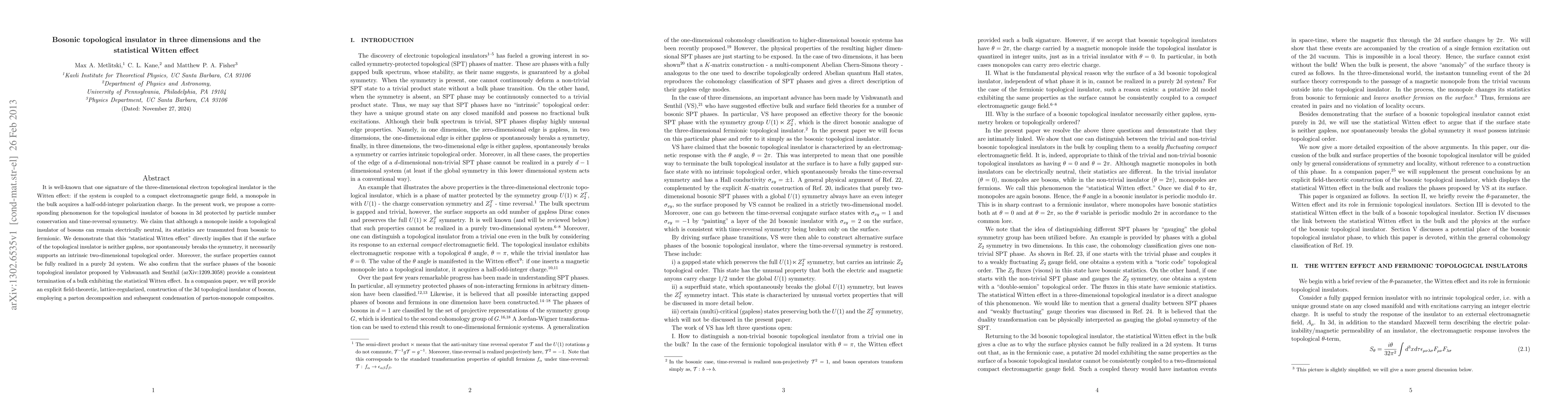 Researchers propose a new phenomenon known as the statistical Witten effect in 3D bosonic topological insulators, where monopoles acquire fermionic statistics despite remaining electrically neutral, implying the existence of intrinsic 2D topological order.