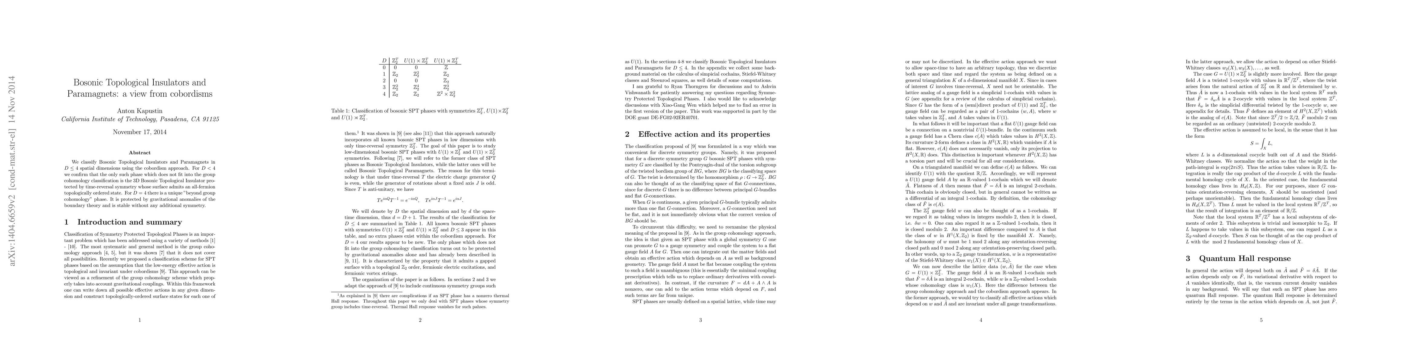 We classify Bosonic Topological Insulators and Paramagnets in D<=4 spatial dimensions using the cobordism approach. For D<4 we confirm that the only such phase which does not fit into the group cohomology classification is the 3D Bosonic Topological Insulator protected by time-reversal symmetry whose surface admits an all-fermion topologically ordered state. For D=4 there is a unique "beyond group cohomology" phase. It is protected by gravitational anomalies of the boundary theory and is stable without any additional symmetry.