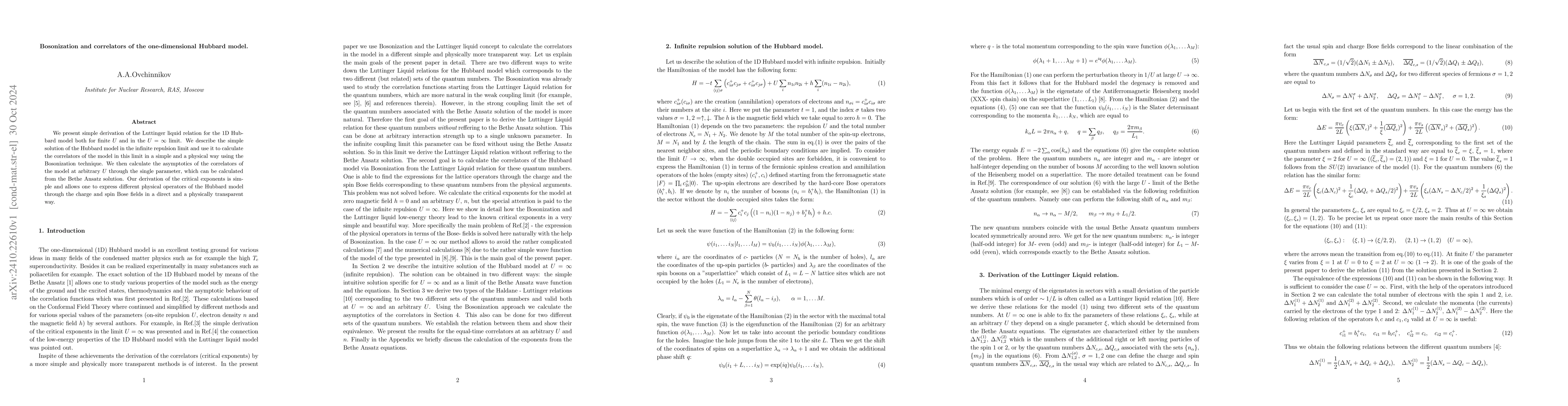 We present simple derivation of the Luttinger liquid relation for the 1D Hubbard model both for finite $U$ and in the $U=\infty$ limit. We describe the simple solution of the Hubbard model in the infinite repulsion limit and use it to calculate the correlators of the model in this limit in a simple and a physical way using the Bosonization technique. We then calculate the asymptotics of the correlators of the model at arbitrary $U$ through the single parameter, which can be calculated from the Bethe Ansatz solution. Our derivation of the critical exponents is simple and allows one to express different physical operators of the Hubbard model through the charge and spin Bose fields in a direct and a physically transparent way.