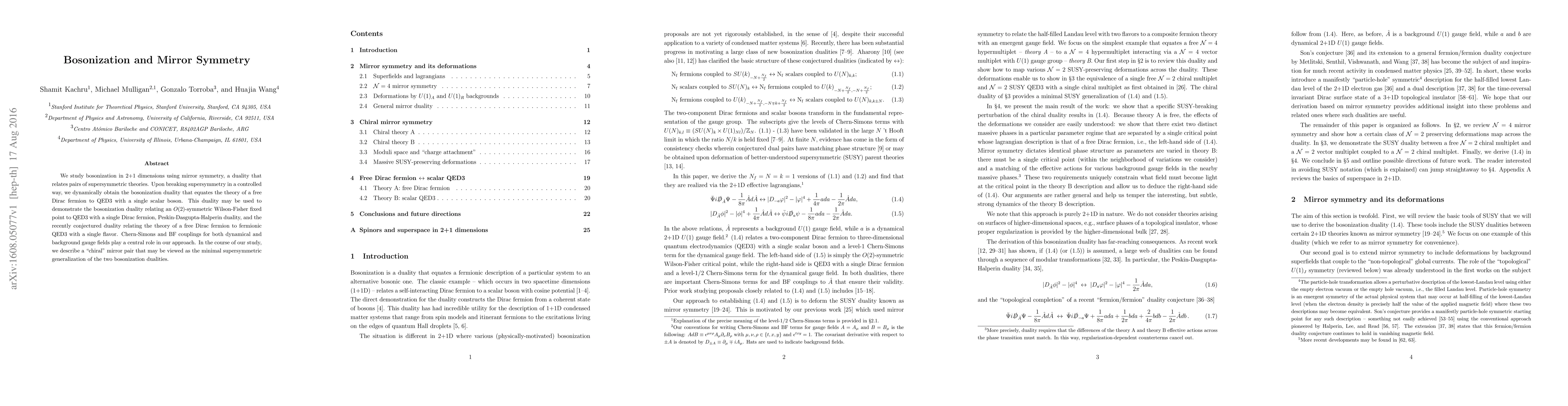 We study bosonization in 2+1 dimensions using mirror symmetry, a duality that relates pairs of supersymmetric theories. Upon breaking supersymmetry in a controlled way, we dynamically obtain the bosonization duality that equates the theory of a free Dirac fermion to QED3 with a single scalar boson. This duality may be used to demonstrate the bosonization duality relating an $O(2)$-symmetric Wilson-Fisher fixed point to QED3 with a single Dirac fermion, Peskin-Dasgupta-Halperin duality, and the recently conjectured duality relating the theory of a free Dirac fermion to fermionic QED3 with a single flavor. Chern-Simons and BF couplings for both dynamical and background gauge fields play a central role in our approach. In the course of our study, we describe a chiral mirror pair that may be viewed as the minimal supersymmetric generalization of the two bosonization dualities.