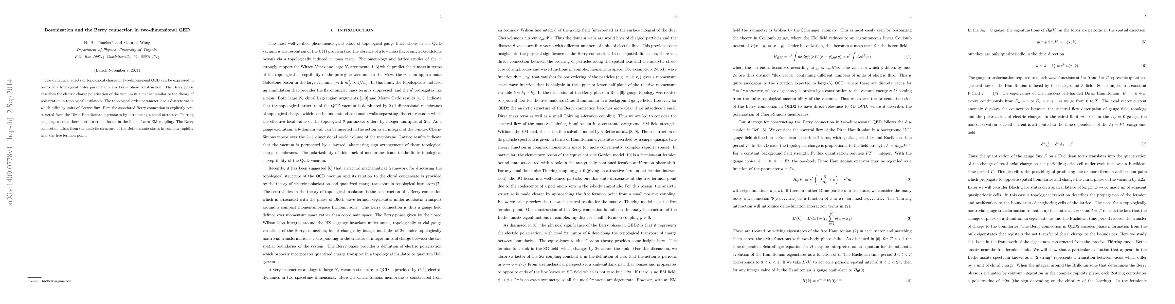 The dynamical effects of topological charge in two-dimensional QED can be expressed in terms of a topological order parameter via a Berry phase construction. The Berry phase describes the electric charge polarization of the vacuum in a manner similar to the theory of polarization in topological insulators. The topological order parameter labels discrete vacua which differ by units of electric flux. Here the associated Berry connection is explicitly constructed from the Dirac Hamiltonian eigenstates by introducing a small attractive Thirring coupling, so that there is still a stable boson in the limit of zero EM coupling. The Berry connection arises from the analytic structure of the Bethe ansatz states in complex rapidity near the free fermion point.