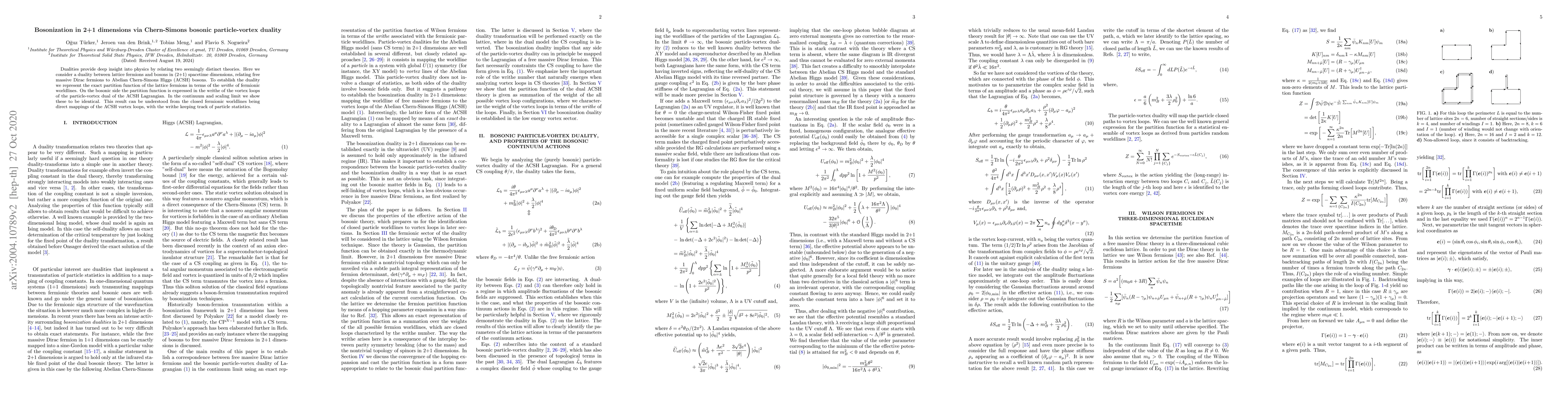 This paper establishes a duality between lattice fermions and Abelian Chern-Simons Higgs bosons in 2+1 dimensions, using particle-vortex duality to represent the fermionic partition function via the writhe of fermionic worldlines, which matches the bosonic partition function through vortex loops. The equivalence in the continuum limit reveals the underlying connection between fermionic and bosonic statistics.
