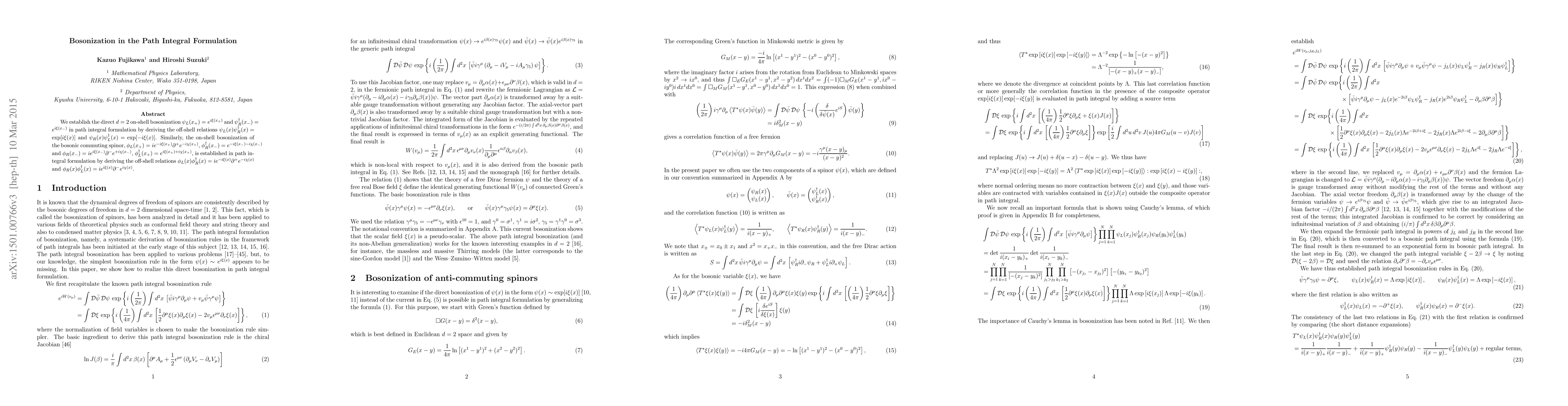 This paper establishes on-shell bosonization in two-dimensional systems within the path integral framework, deriving off-shell relations for both fermionic and bosonic commuting spinors. The key results include $\psi_{L}\psi_{R}^{\dagger}=\exp[i\xi]$ and $\phi_{L}\phi^{\dagger}_{R}=ie^{-i\xi}\partial^{+}e^{-i\chi}$.