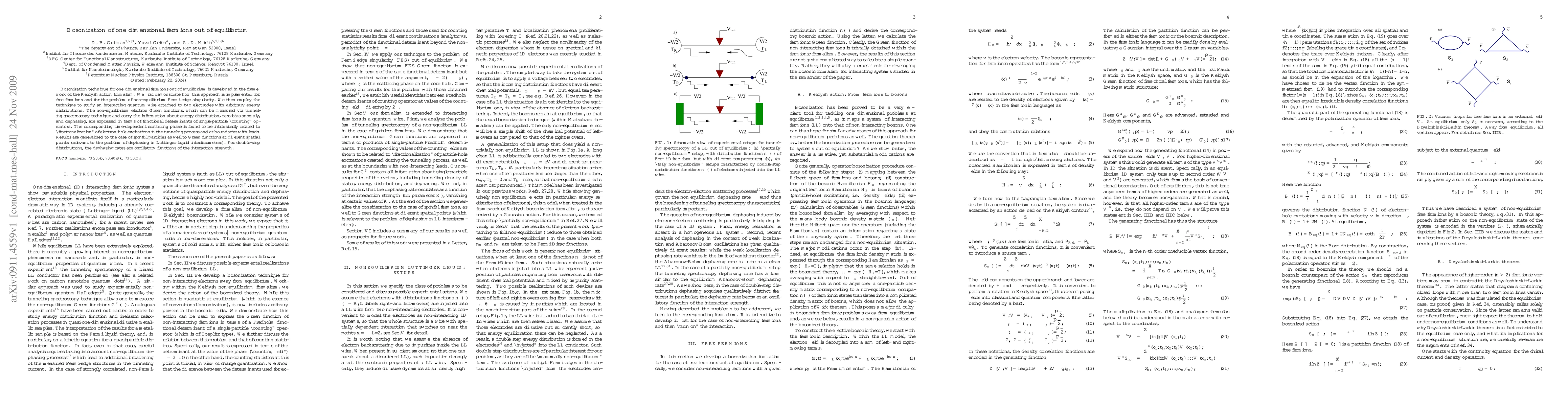 This paper develops a bosonization technique for out-of-equilibrium one-dimensional fermions using the Keldysh formalism, applying it to interacting quantum wires and deriving non-equilibrium electron Green functions in terms of functional determinants. The study reveals the intrinsic relationship between scattering phase and electron-hole excitations, and finds oscillatory dephasing rates for double-step distributions.