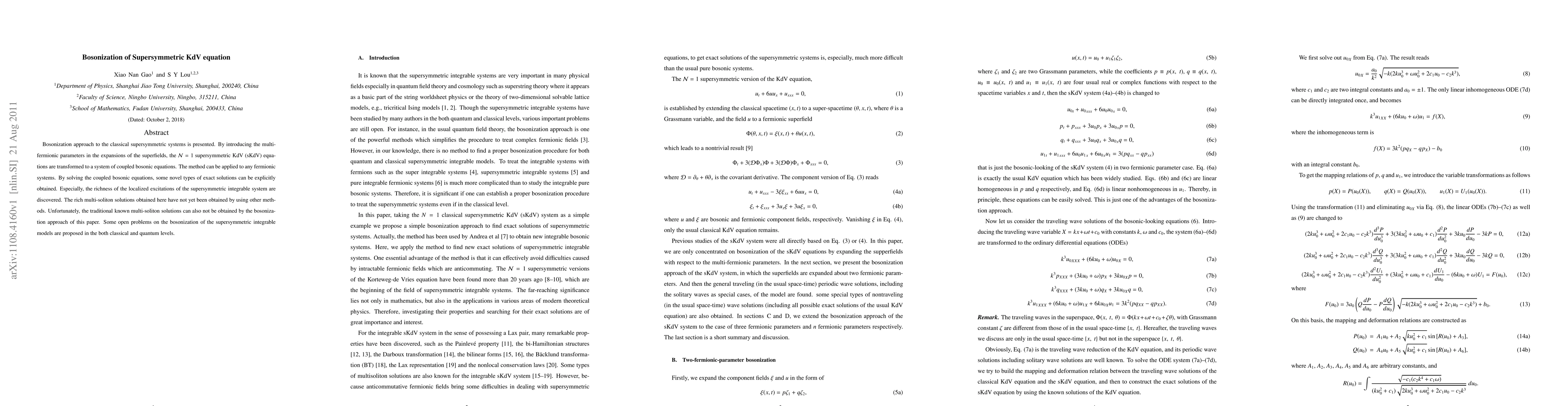 Bosonization approach to the classical supersymmetric systems is presented. By introducing the multi-fermionic parameters in the expansions of the superfields, the $\mathcal {N}=1$ supersymmetric KdV (sKdV) equations are transformed to a system of coupled bosonic equations. The method can be applied to any fermionic systems. By solving the coupled bosonic equations, some novel types of exact solutions can be explicitly obtained. Especially, the richness of the localized excitations of the supersymmetric integrable system are discovered. The rich multi-soliton solutions obtained here have not yet been obtained by using other methods. Unfortunately, the traditional known multi-soliton solutions can also not be obtained by the bosonization approach of this paper. Some open problems on the bosonization of the supersymmetric integrable models are proposed in the both classical and quantum levels.